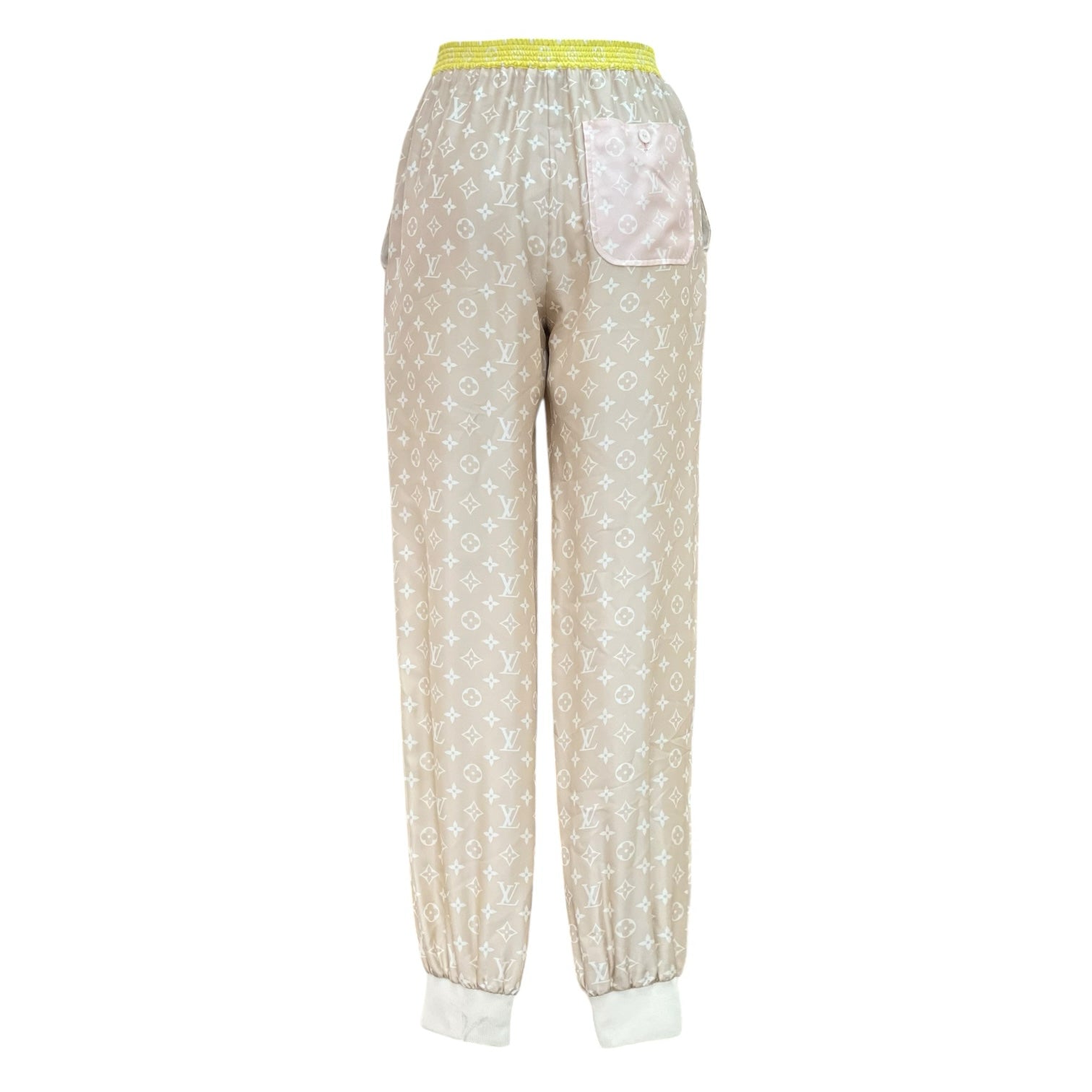 The Louis Vuitton Beige Monogram Silk Jogger Pants feature an all-over tonal LV monogram pattern, contrasted with a bright yellow smocked elastic waistband and white ribbed ankle cuffs. Designed with side slit pockets and a light pink satin patch pocket at the back, these lightweight silk joggers blend sporty comfort with the elegance and refinement of Louis Vuitton craftsmanship.