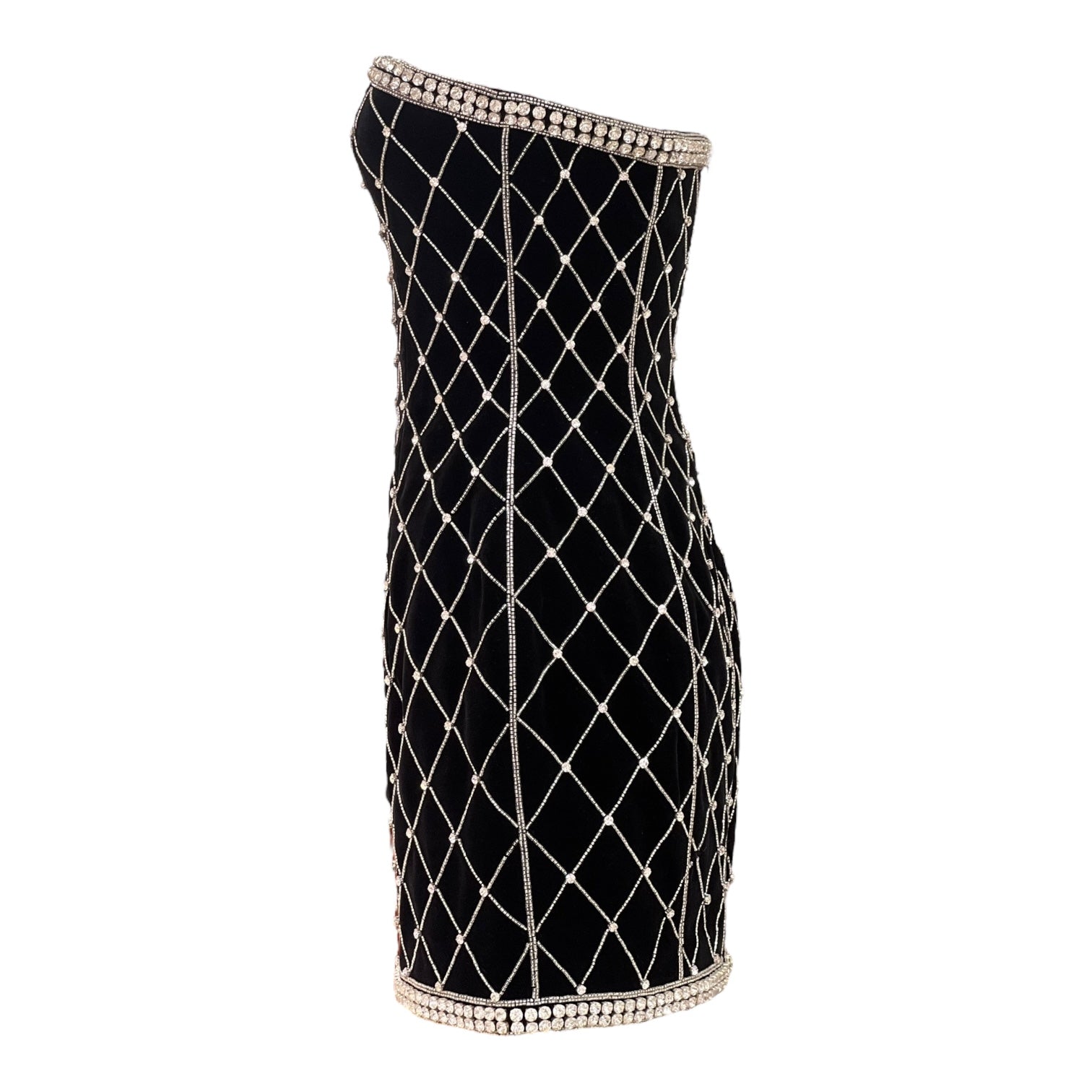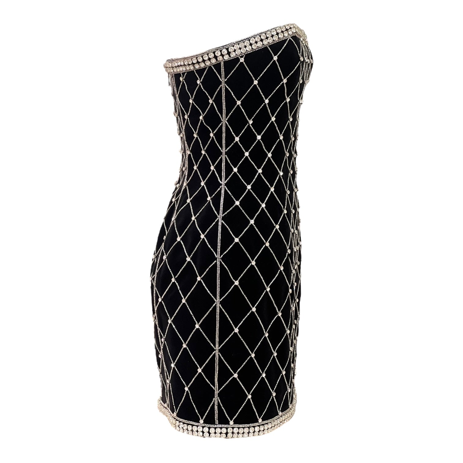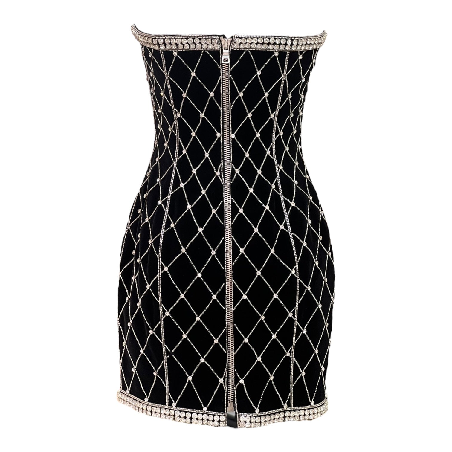 A striking Balmain strapless mini dress crafted in plush black velvet, designed with a figure-sculpting silhouette. The piece is adorned with an all-over crystal lattice embellishment, framed by crystal trim along the neckline and hem for a glamorous finish. A signature example of Balmain’s bold Parisian aesthetic — perfect for evening occasions and red-carpet style.