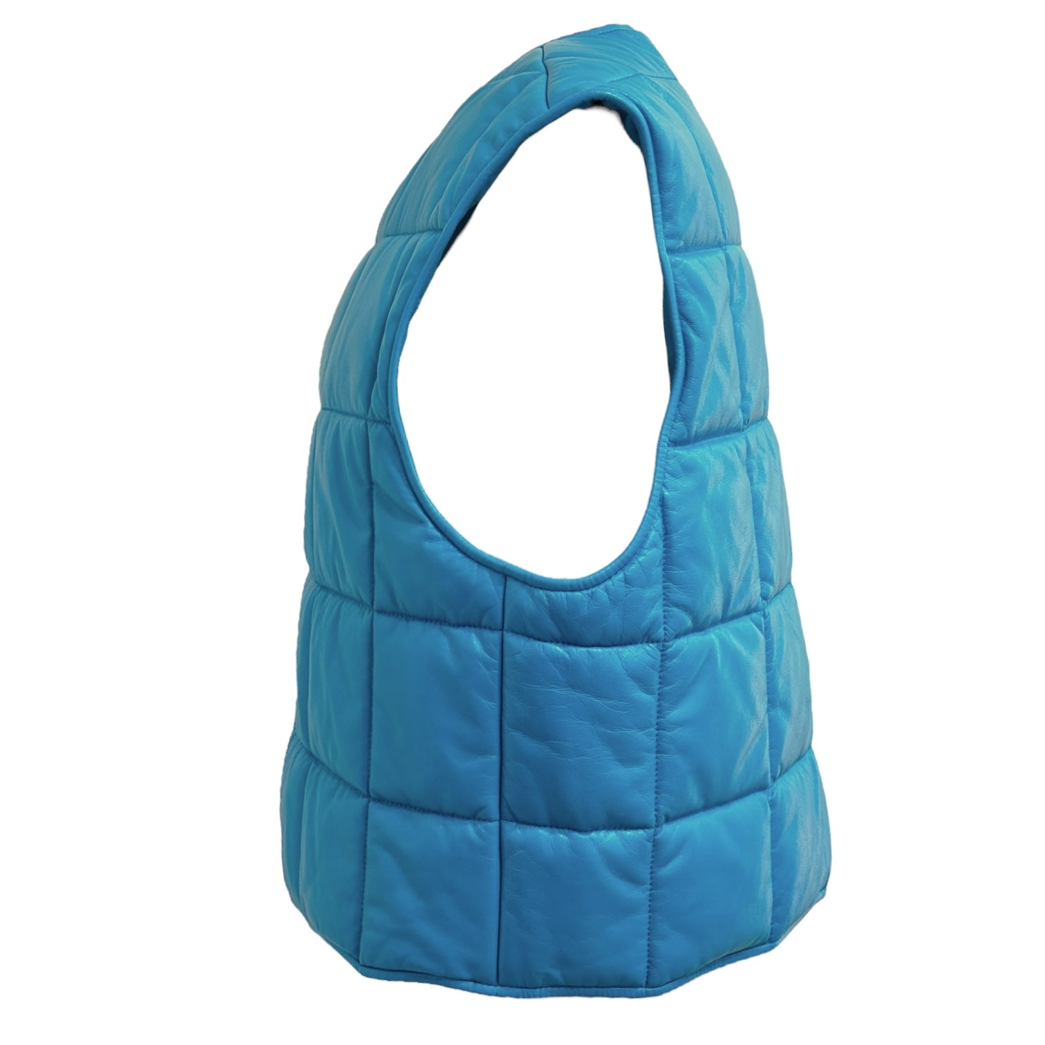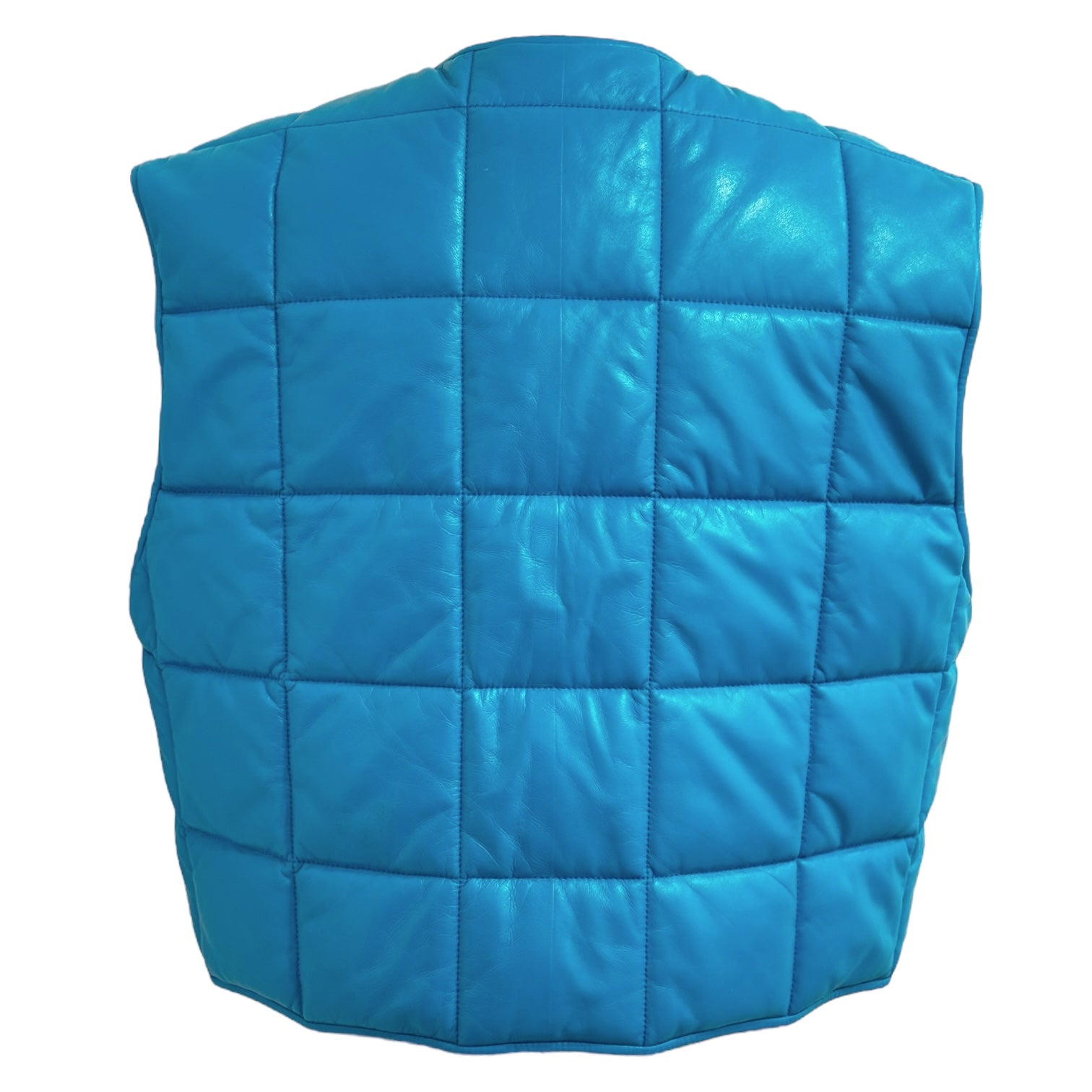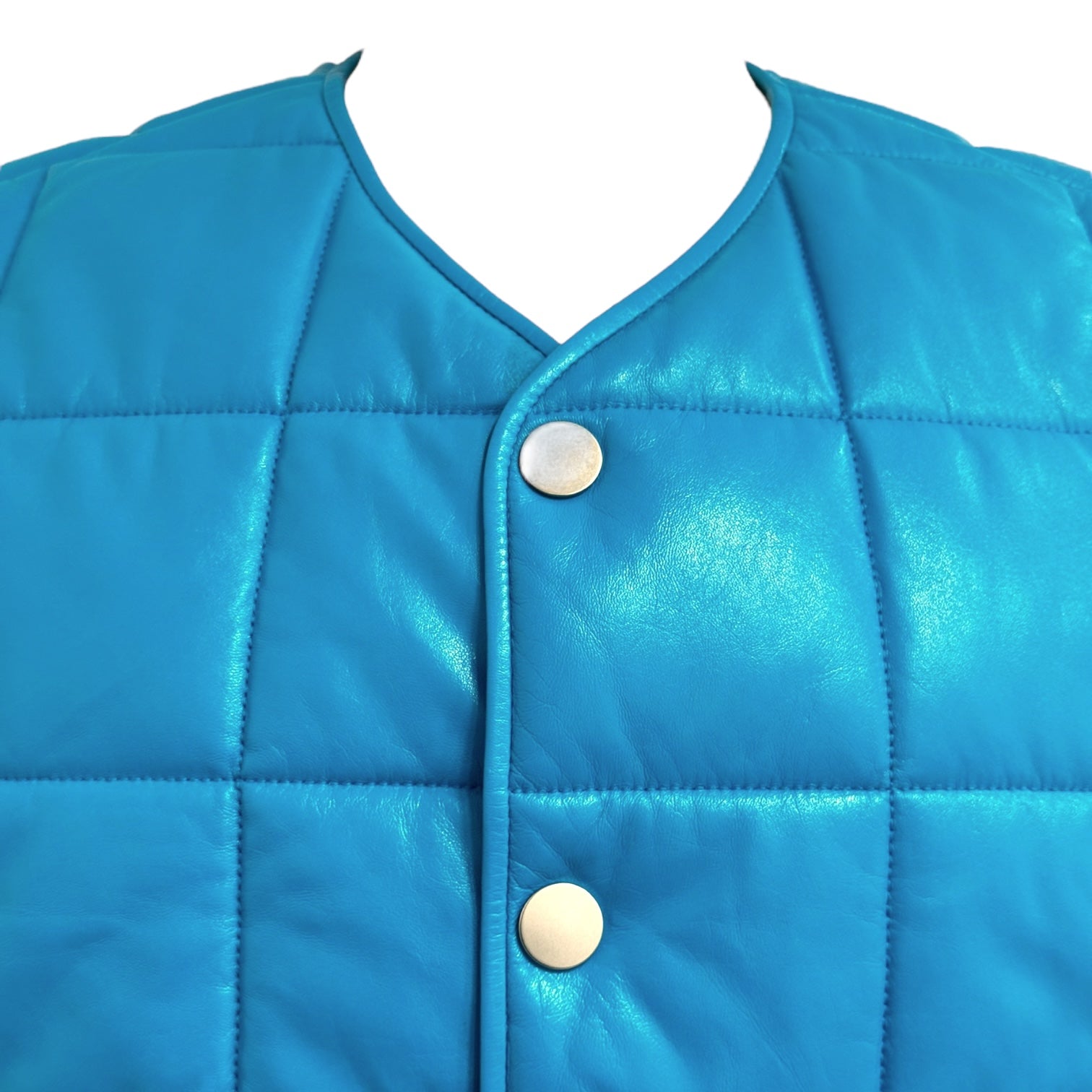 Elevate your layering with this striking Bottega Veneta blue quilted leather gilet. Crafted from supple leather in a bold sky-blue hue, it features a grid-stitched design that combines structure with modern edge. The sleeveless silhouette is finished with a V-neckline and silver-tone snap button closures for a sleek, versatile look. Perfect for transitional styling, this piece embodies the house’s mastery of contemporary luxury.