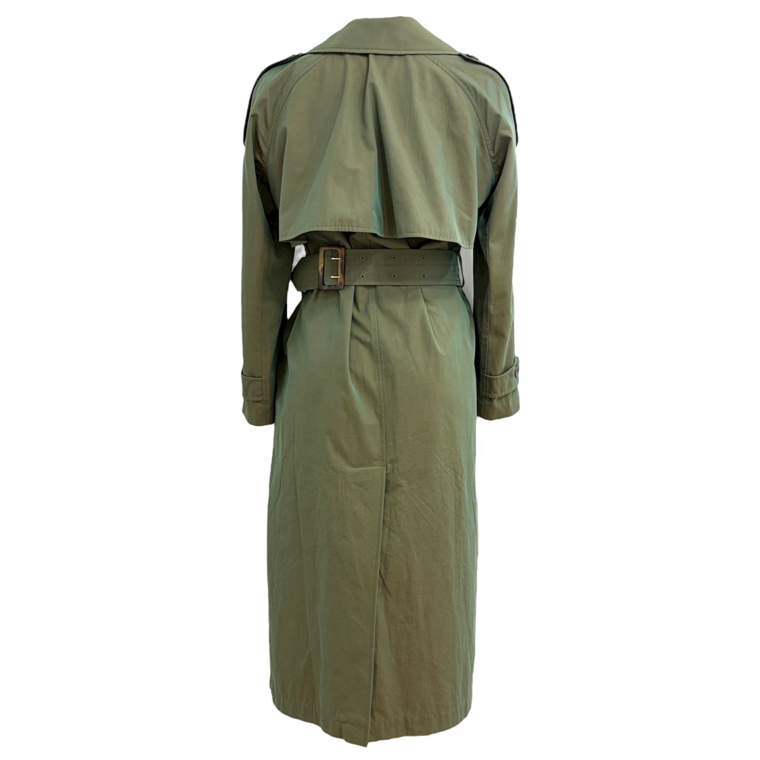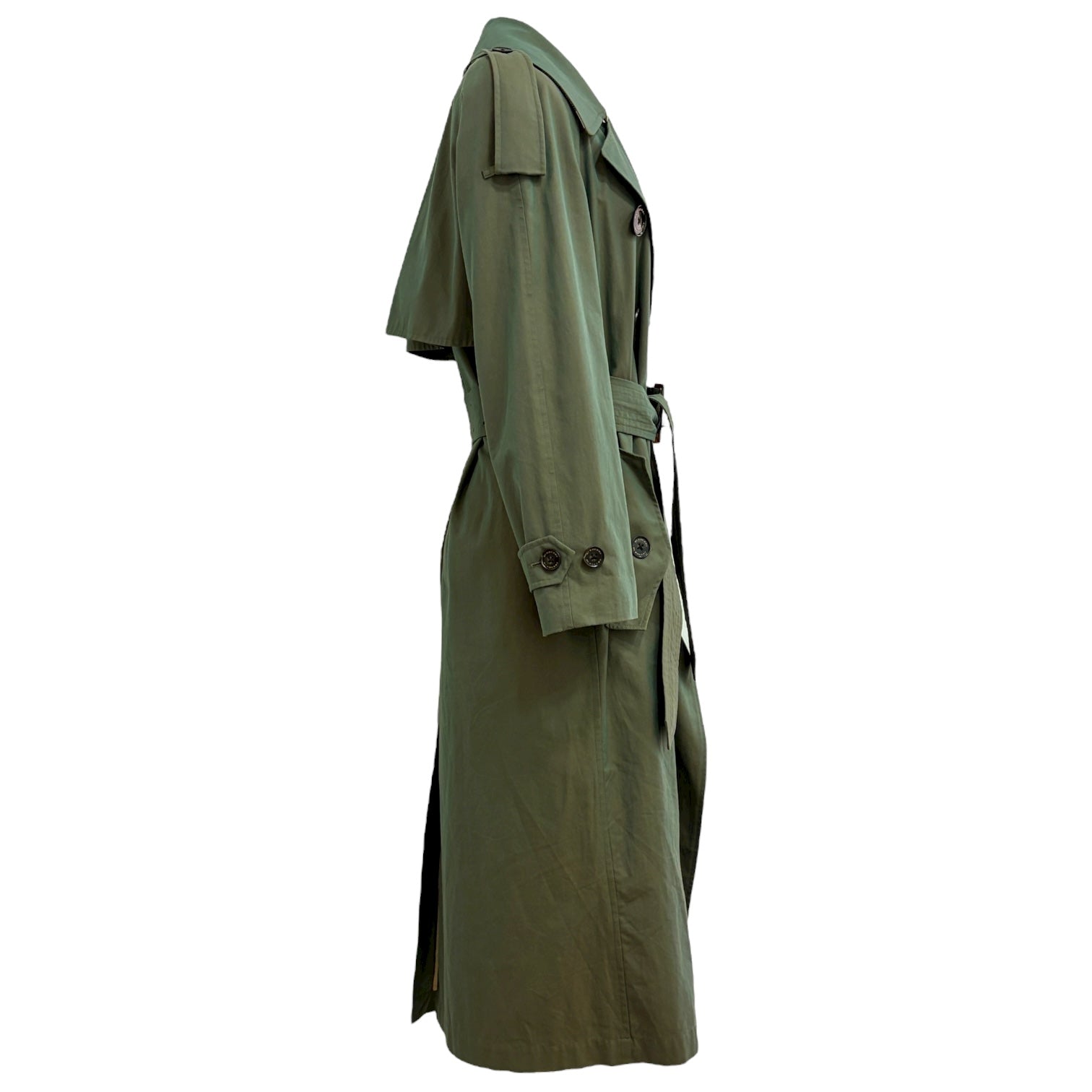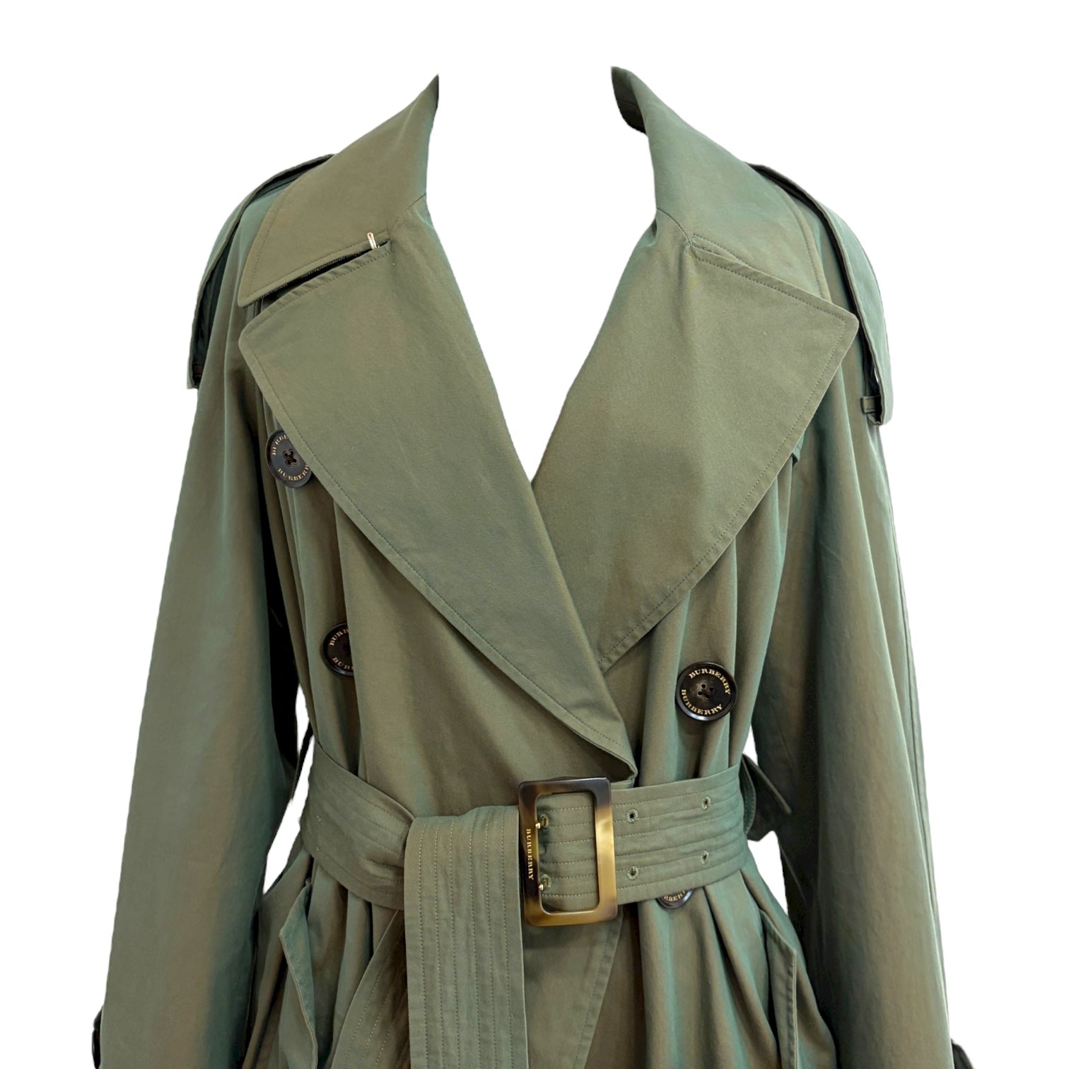 Crafted from iridescent khaki green fabric, this Burberry trench coat brings a modern twist to the house’s iconic silhouette. Featuring a double-breasted design, wide lapels, and a waist-cinching belt, it blends classic tailoring with a subtle luminous finish. Elegant, versatile, and effortlessly chic — a standout piece for any season.