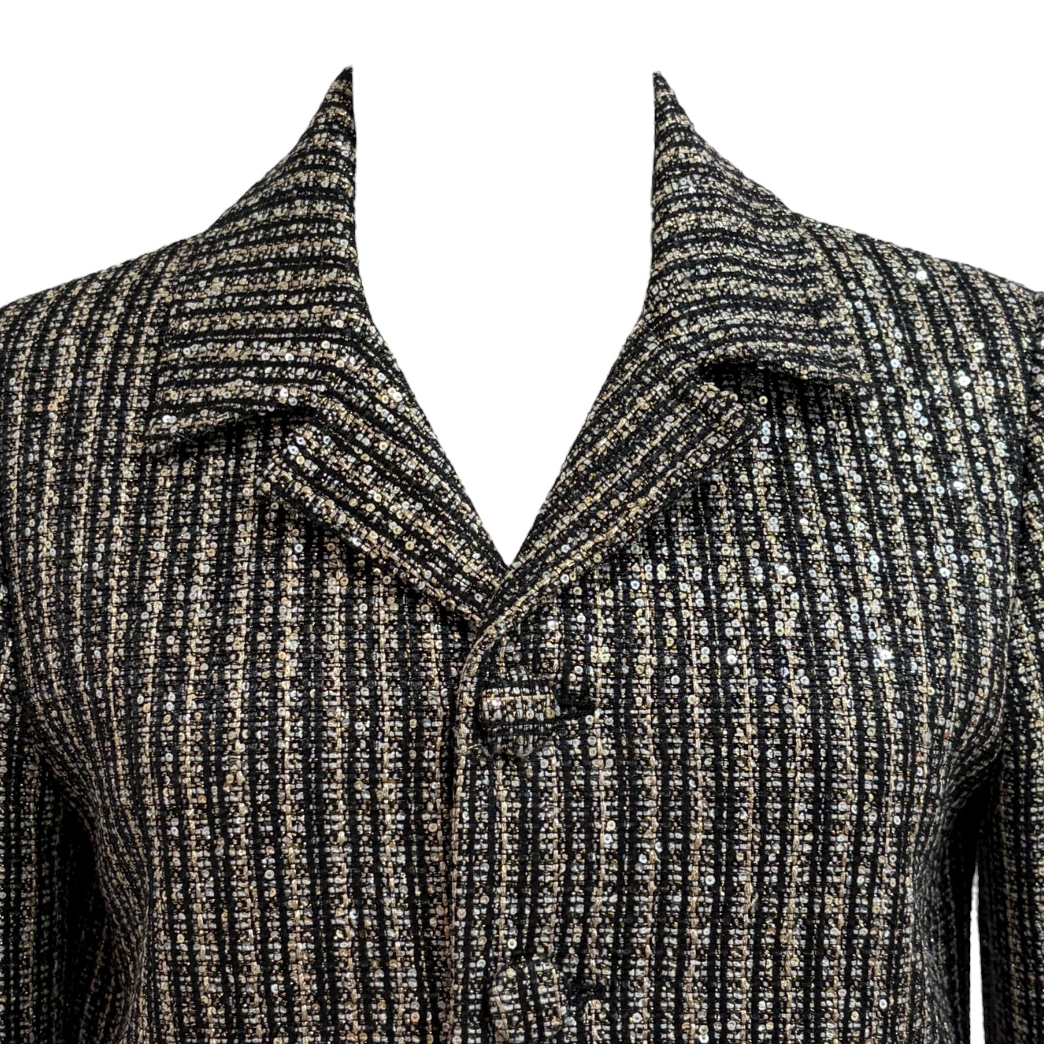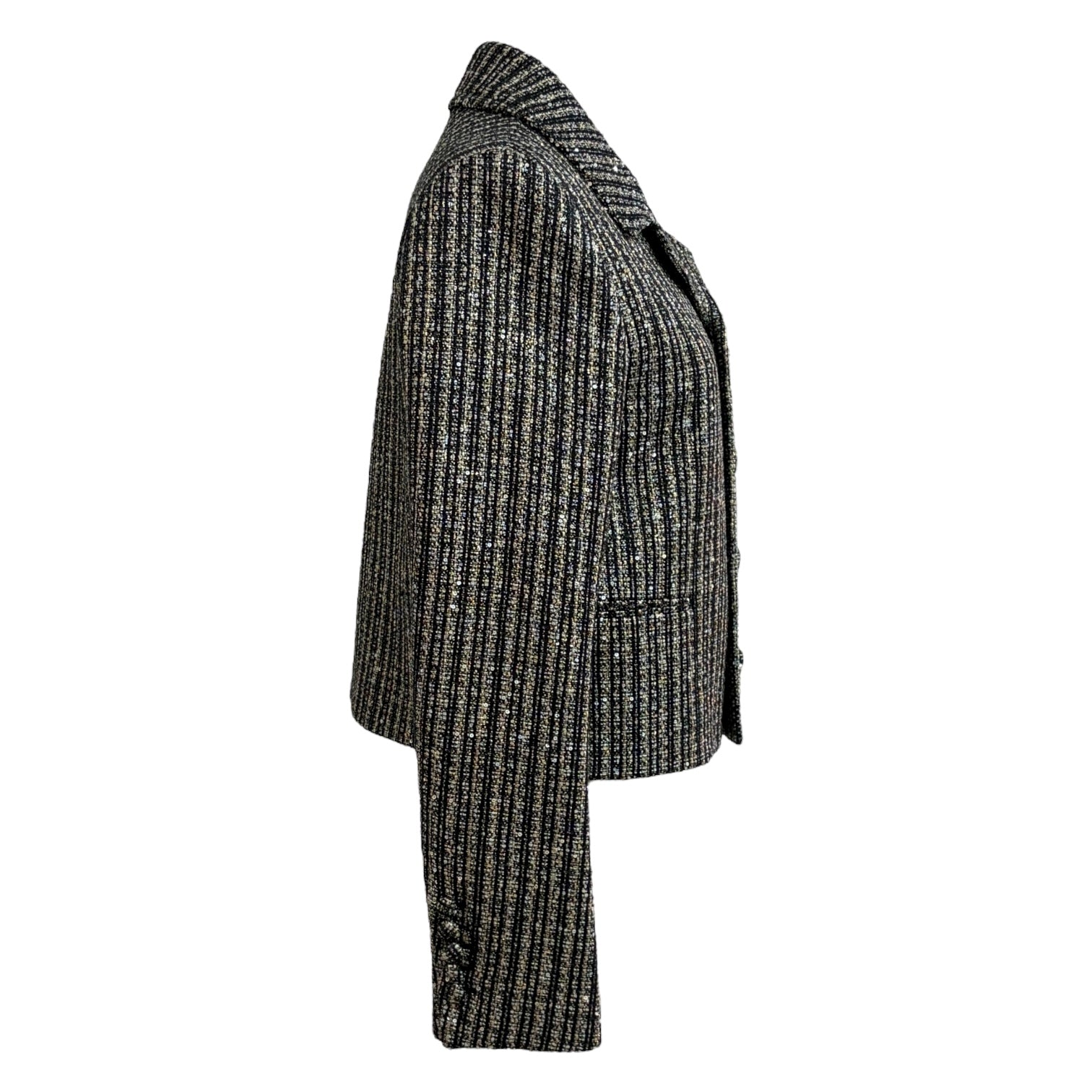 This Saint Laurent jacket exudes sophisticated Parisian edge with its shimmering black and silver metallic striped tweed. Tailored in a structured silhouette, it features sharp lapels, covered button closures, and subtle front pockets for a sleek, refined finish. The lustrous metallic threading adds a glamorous touch, making it a perfect statement piece for evening occasions or elevating daywear with Saint Laurent’s signature rock-chic elegance.