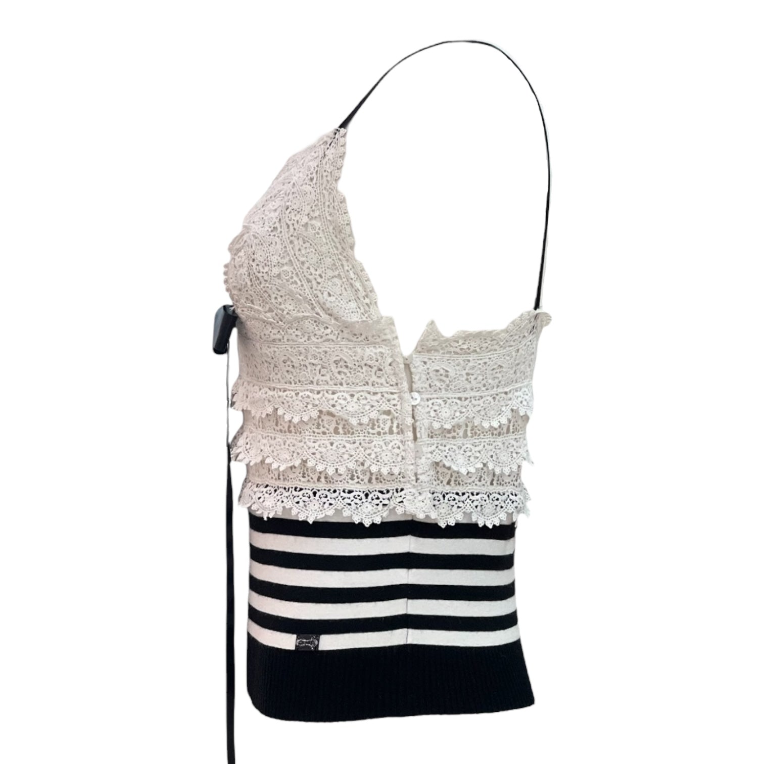 Chanel White Lace & Black Striped Knit Camisole Top with Satin Bow Detail