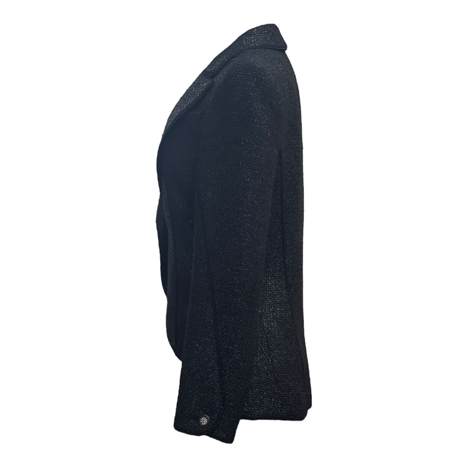 This Chanel Black Tweed Asymmetric Hem Tailored Blazer exudes timeless sophistication with a modern twist. Crafted from classic black tweed, it features a sharp tailored silhouette with structured shoulders and a cinched waist for a flattering fit. The blazer is designed with a unique asymmetric hemline, a deep notched lapel, and a single CC-embossed button closure at the front. Finished with long sleeves and button accents at the cuffs, this piece perfectly balances Chanel’s signature elegance with contemporary edge.