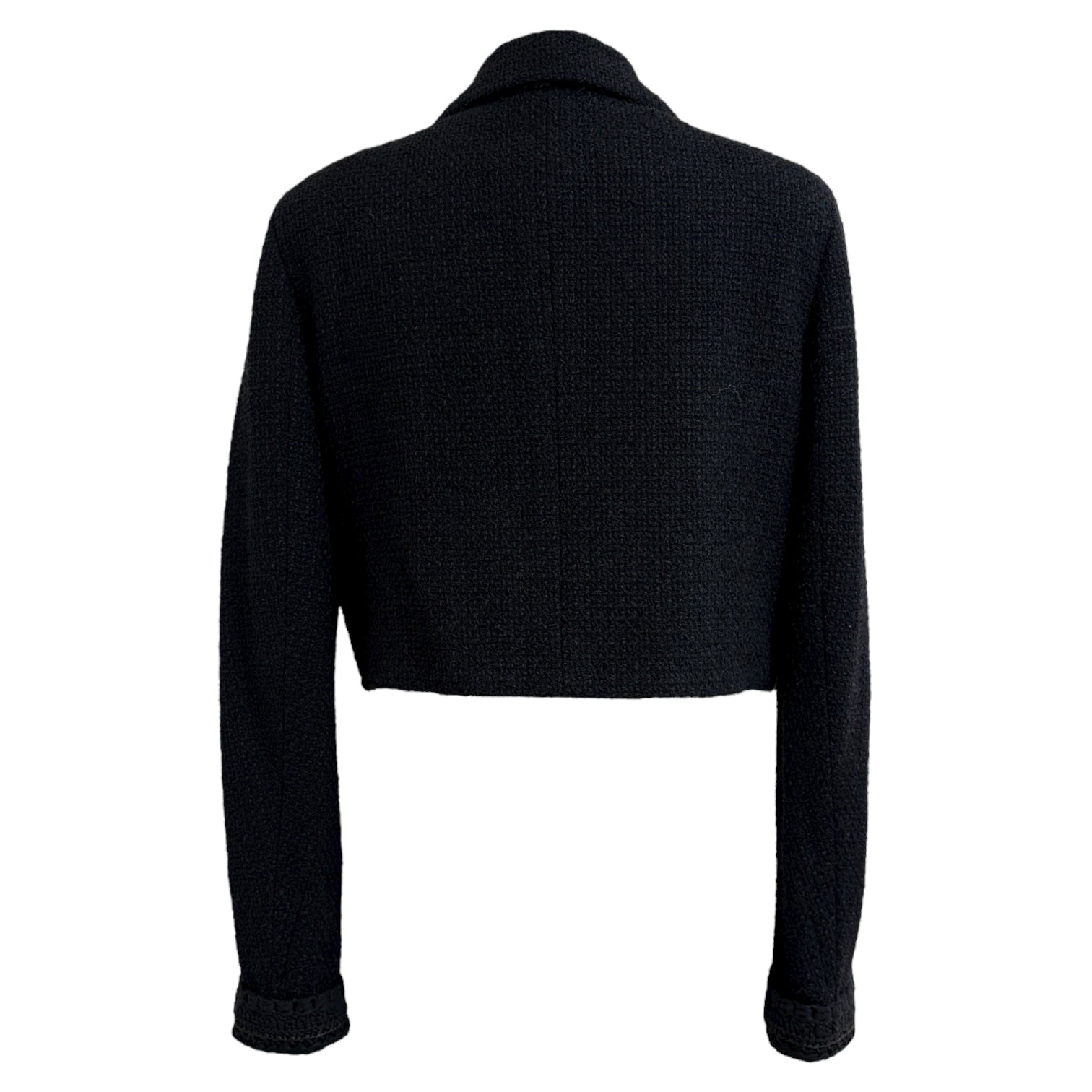 A timeless Chanel cropped jacket crafted from classic black tweed, showcasing the maison’s refined craftsmanship. The design features signature braided trim detailing along the lapels and front, adorned with silver-tone logo-engraved buttons on the cuffs and pockets for an elegant finish. The structured silhouette and slightly cropped length exude modern sophistication while maintaining Chanel’s signature Parisian elegance.