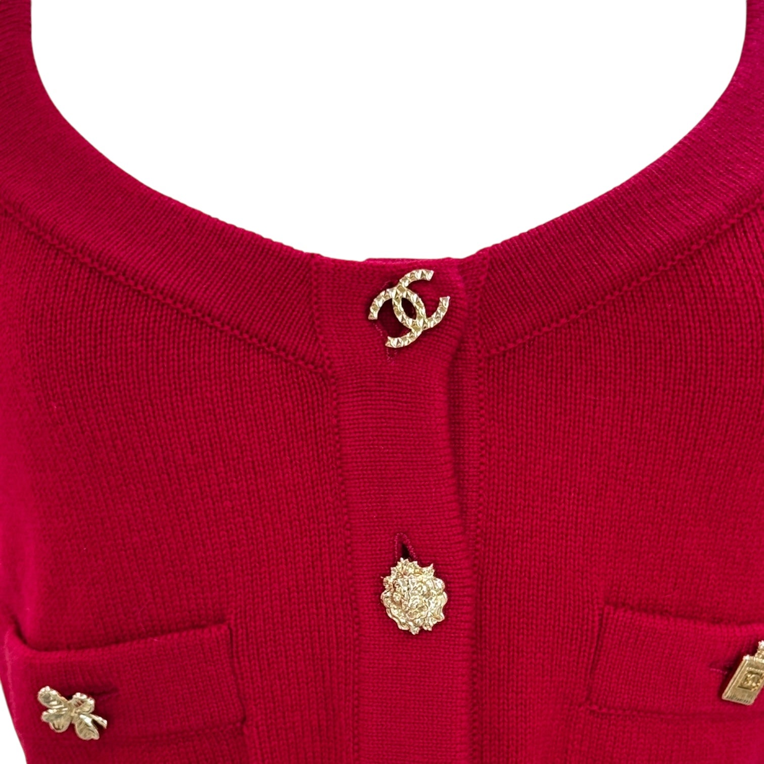 This Chanel fuchsia cashmere crop top features soft cashmere, wide shoulder straps, and a scoop neckline. Gold-tone buttons displaying iconic Chanel motifs and two small front pockets add a refined, playful detail, blending classic elegance with a modern edge.