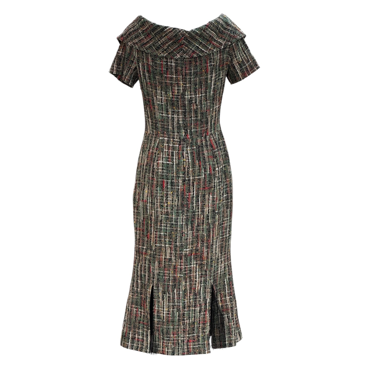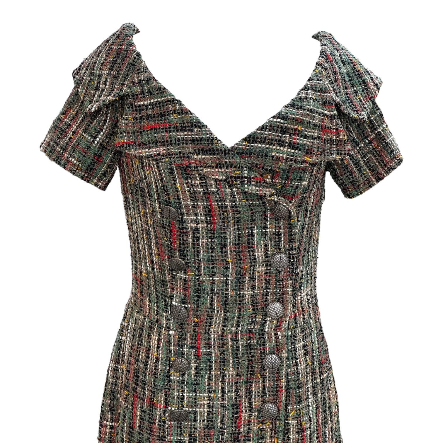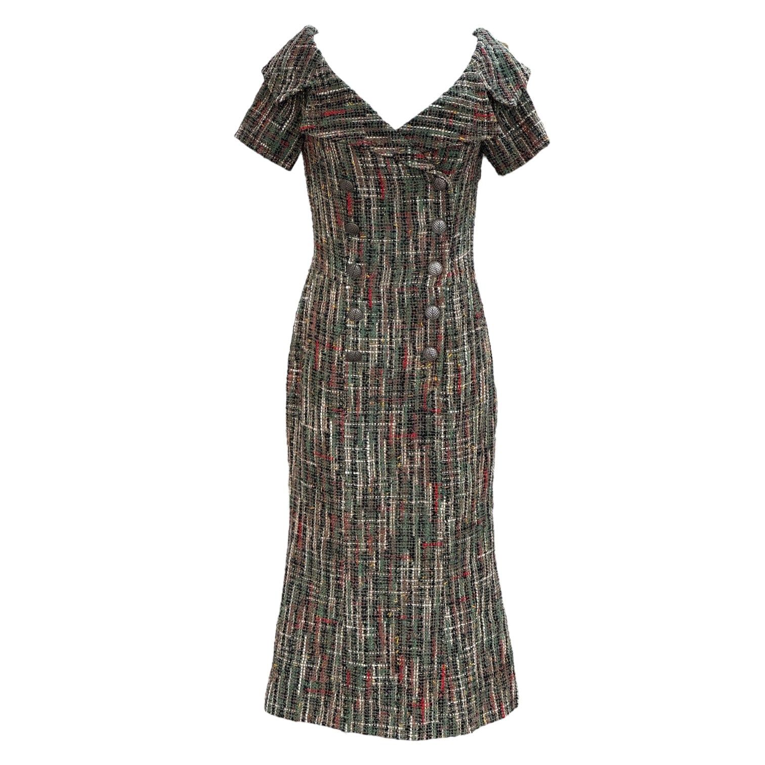 Chanel Green Double Breasted Tweed Midi Dress blends earthy tones with sophisticated design elements like an off-shoulder neckline, layered sleeves, and an asymmetric front adorned with signature Chanel buttons. Its fitted silhouette flares slightly for comfort, showcasing impeccable craftsmanship in a timeless, elegant style.