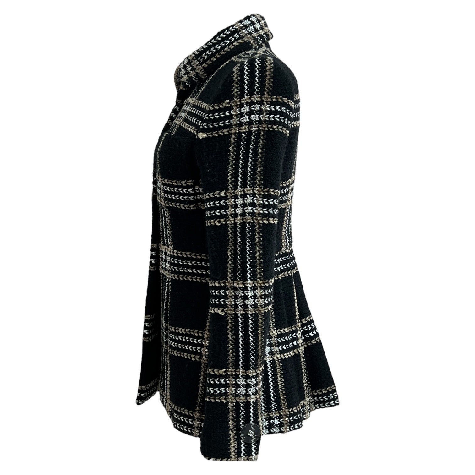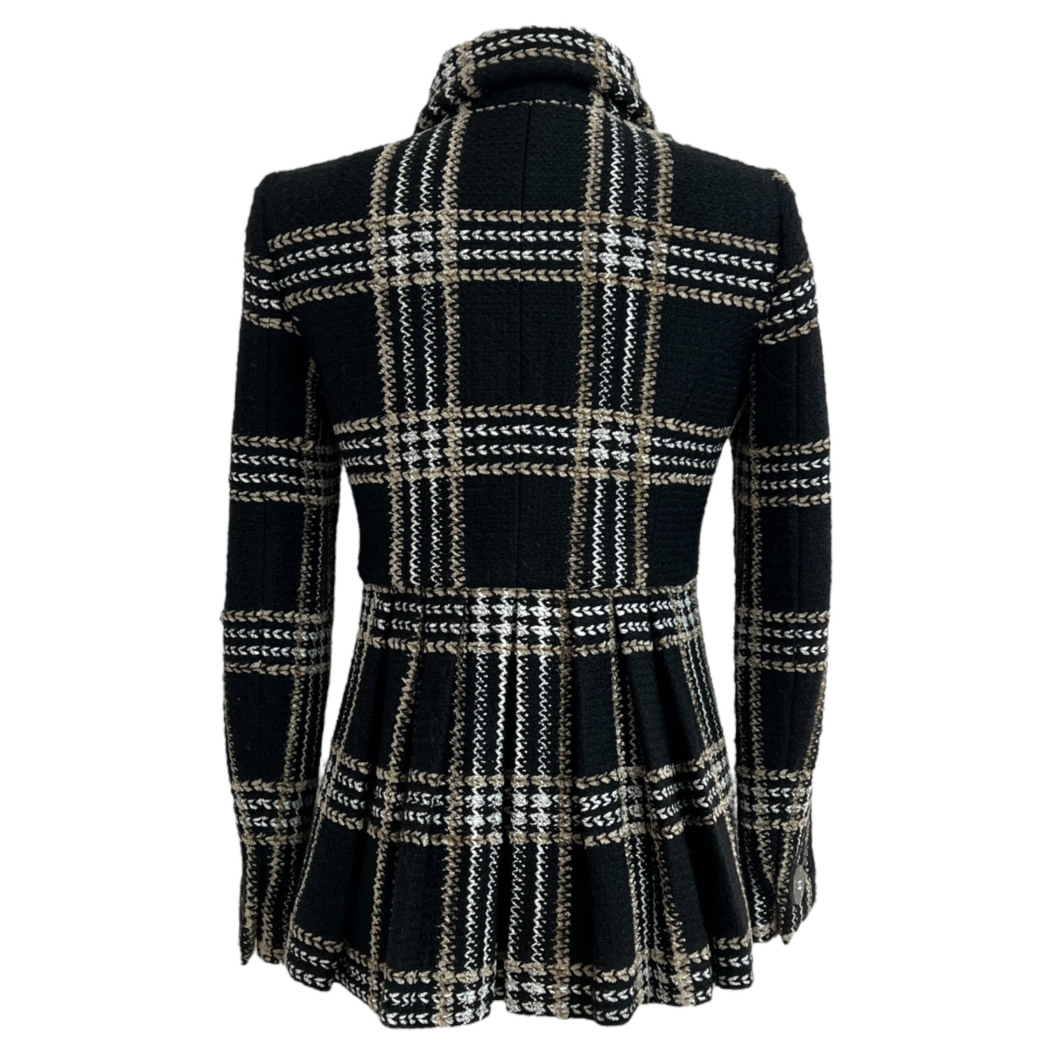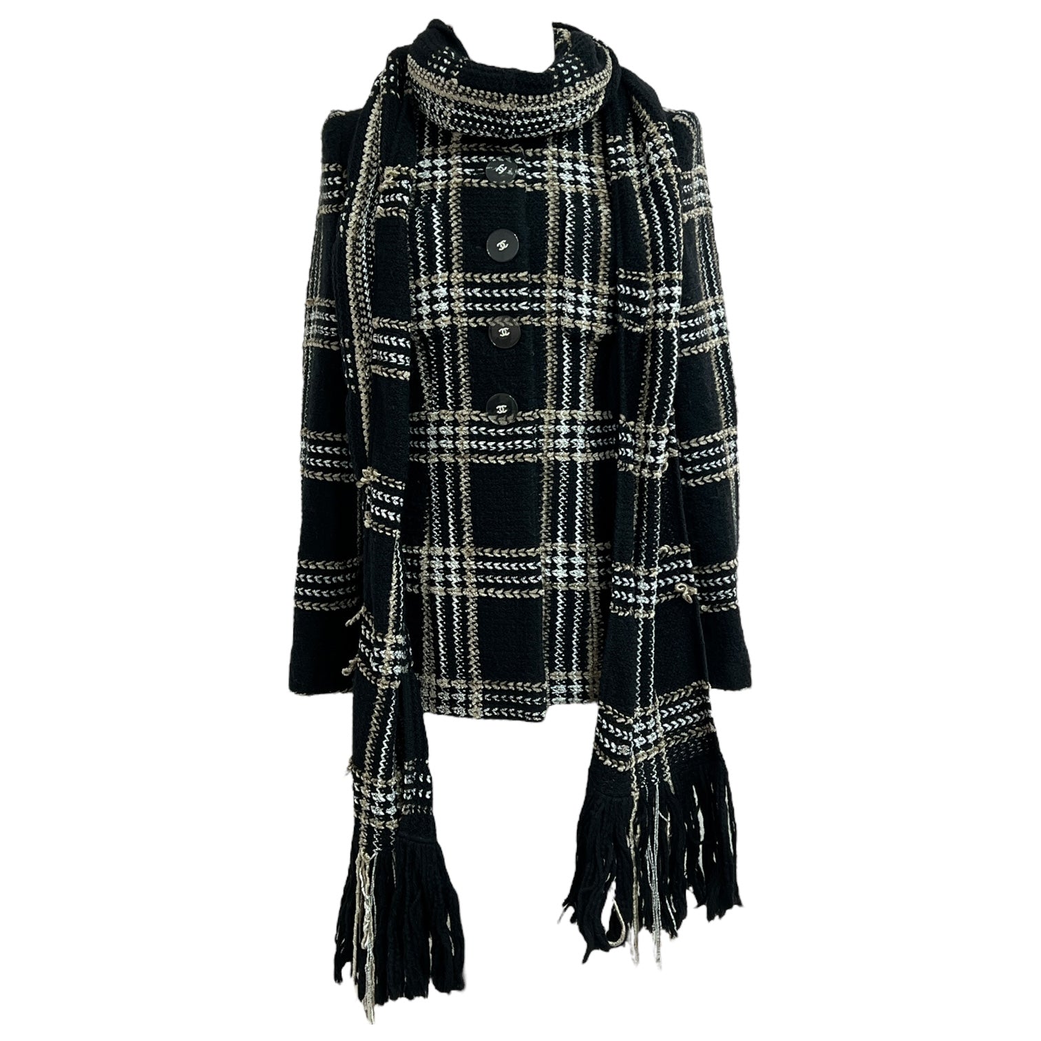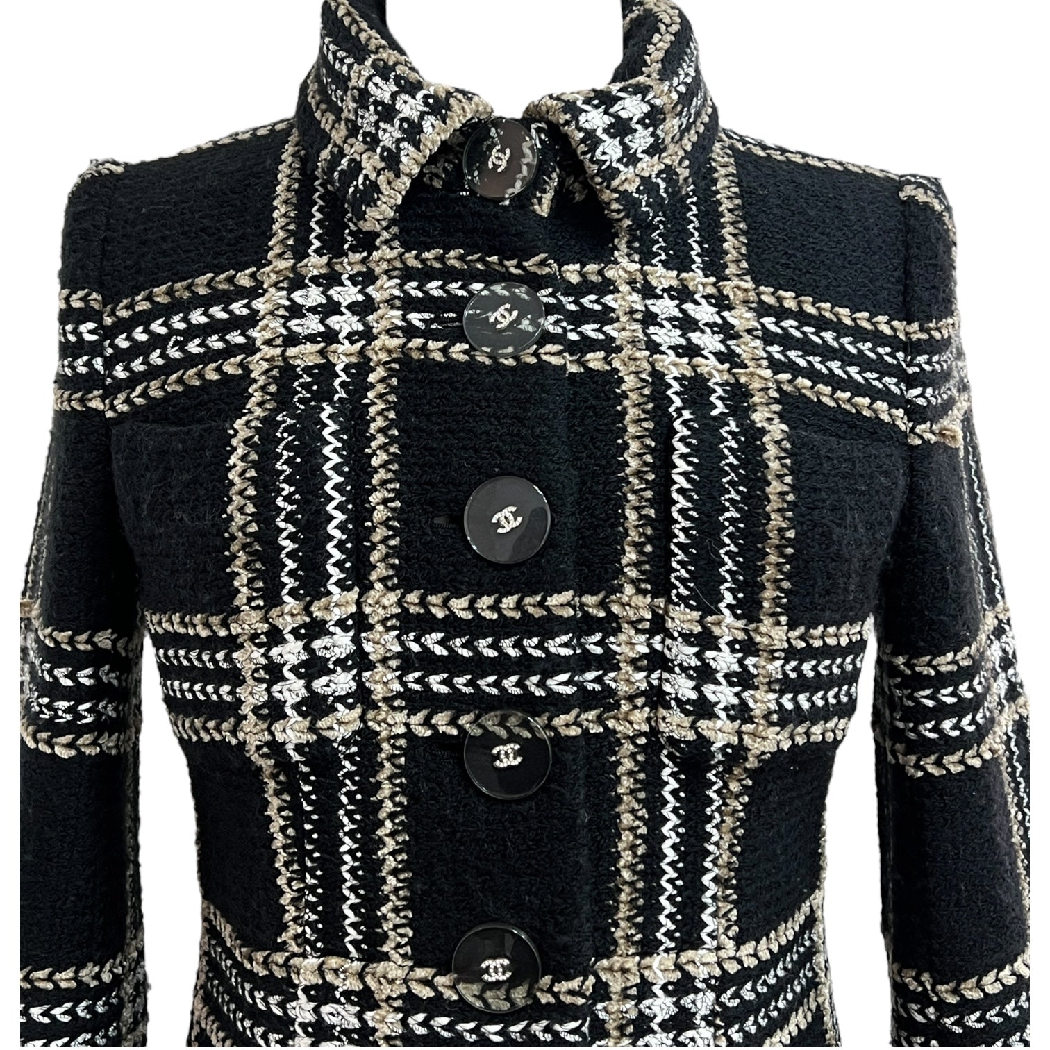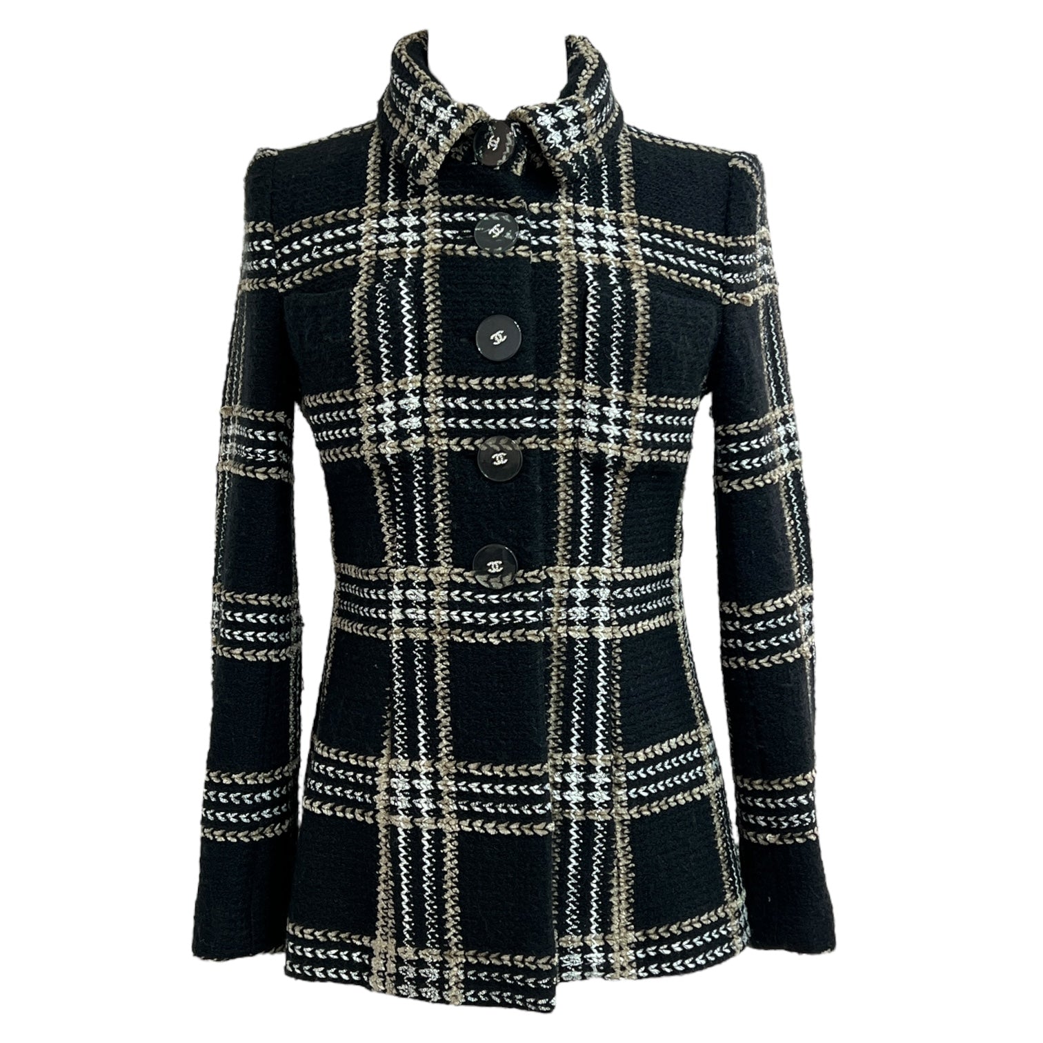 A refined Chanel two-piece set featuring a tailored jacket and matching scarf, crafted in black tweed with subtle gold-brown check accents. The jacket showcases a structured double-breasted front with signature CC-embossed buttons, while the coordinating fringed scarf adds layered warmth and elegance. A timeless and versatile ensemble that highlights Chanel’s mastery of luxury tailoring.