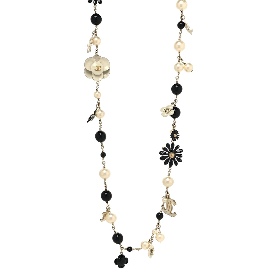 Add a whimsical touch of Chanel elegance to your look with this Black & White Pearl Camellia Charm CC Long Necklace. This intricate design features a mix of faux pearls, black beads, and an array of signature Chanel charms, including camellias, clovers, daisies, and interlocking CC logos. The charming asymmetrical layout offers dynamic movement and visual interest, while the long length allows for versatile styling — wear it doubled, layered, or as a single statement strand. A beautiful blend of classic black and white tones with playful floral accents, this piece captures the timeless yet fashion-forward spirit of Chanel.