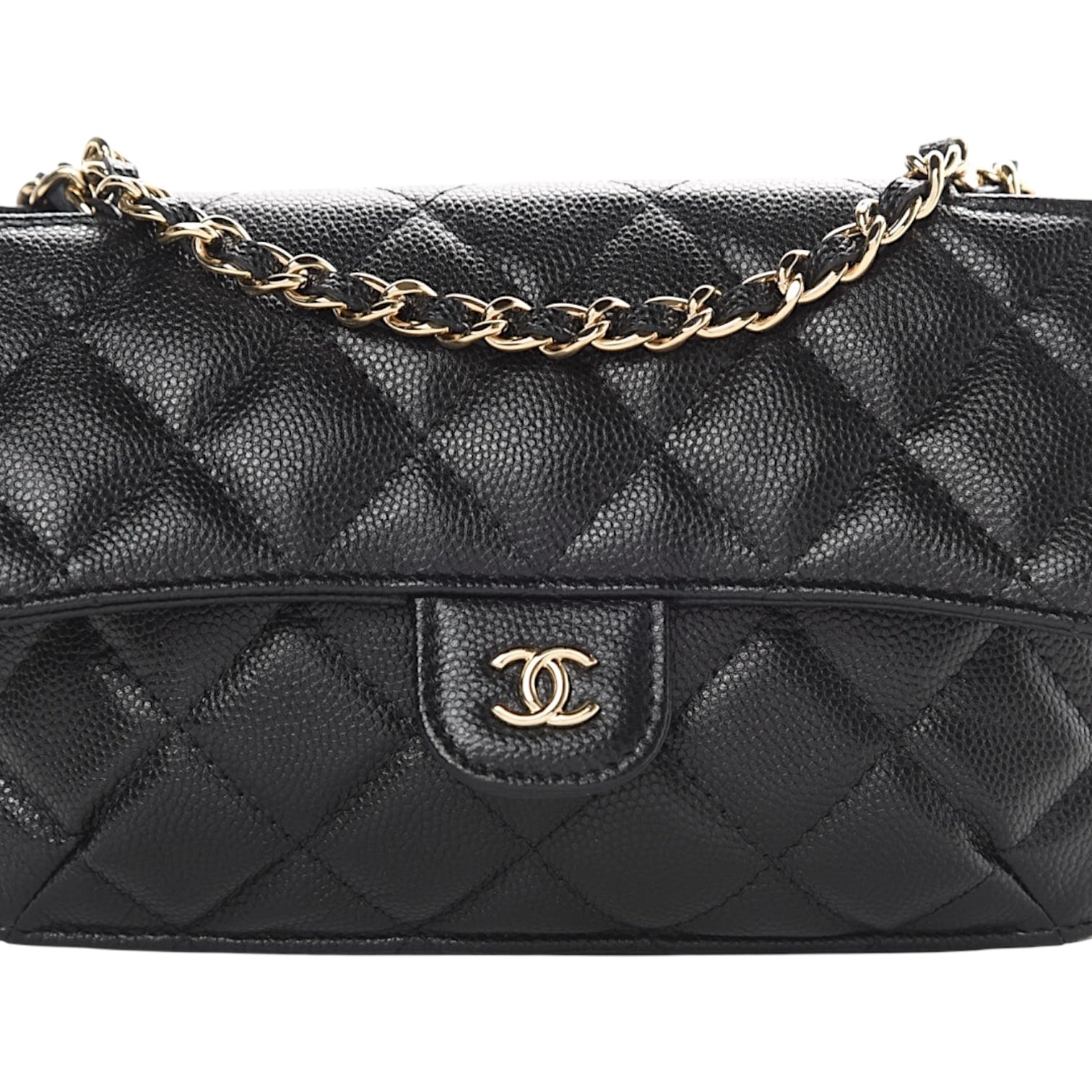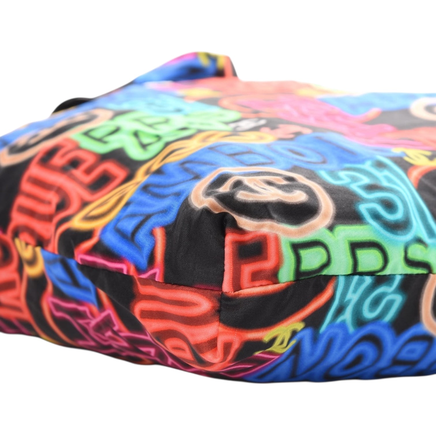 Bold, playful, and functional, this Chanel Foldable Tote features a vibrant multicolour graffiti print over a soft black fabric, paired with classic black Caviar leather trim. The standout detail is the fold-over flap in quilted Caviar leather with the iconic CC turn-lock closure, revealing a cleverly hidden crossbody chain strap that adds versatility and structure. This rare and eye-catching piece effortlessly transitions from a casual tote to an elevated crossbody, making it ideal for travel, city days, or collector’s display.