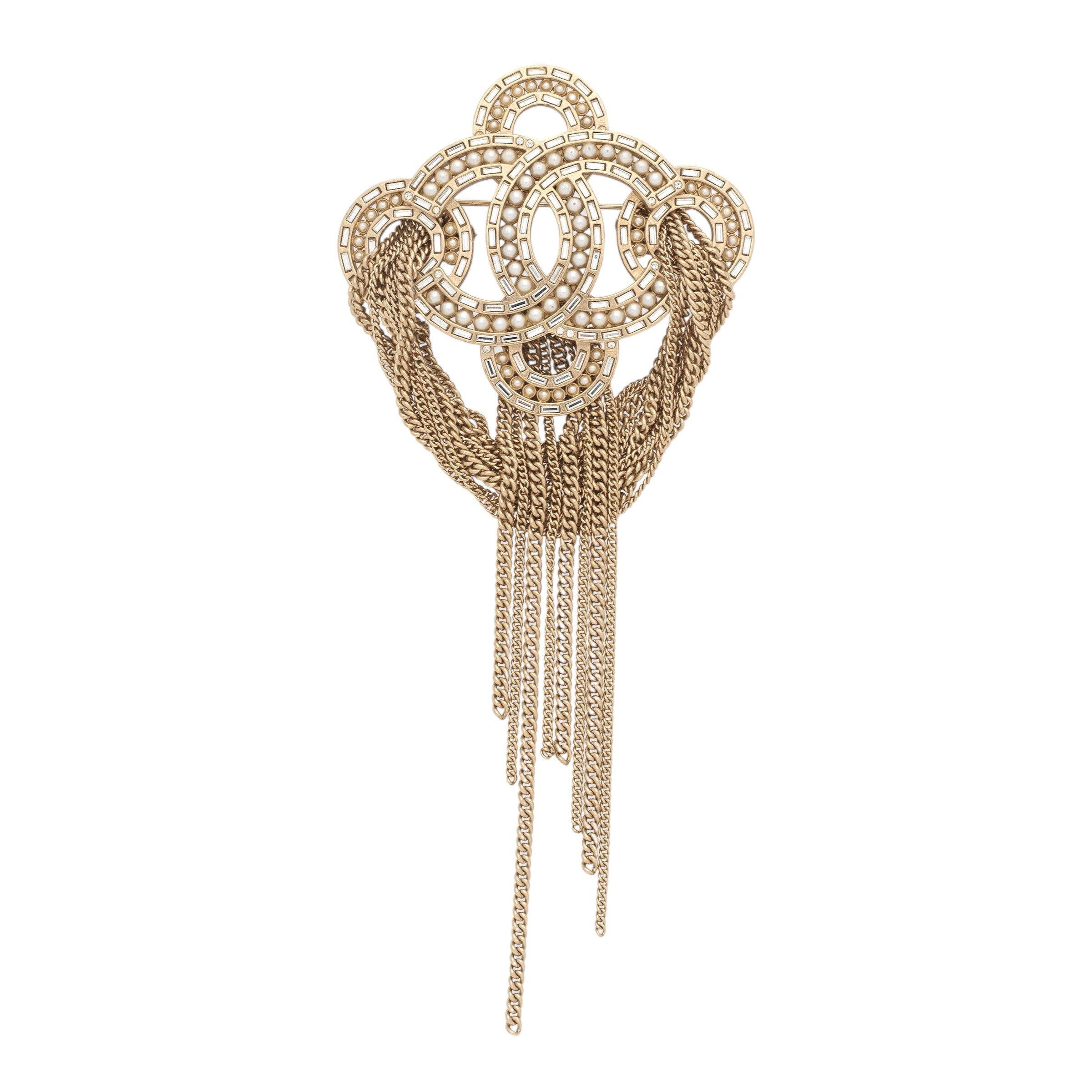 Chanel Champagne Gold Tassel And Pearl CC Pin Brooch