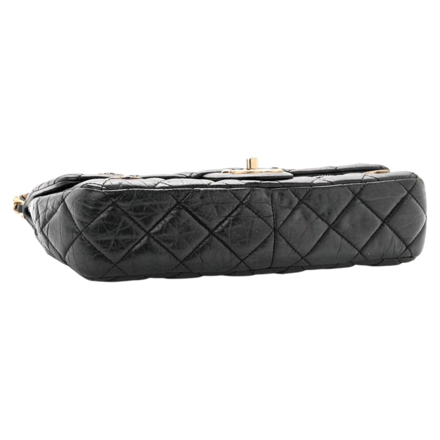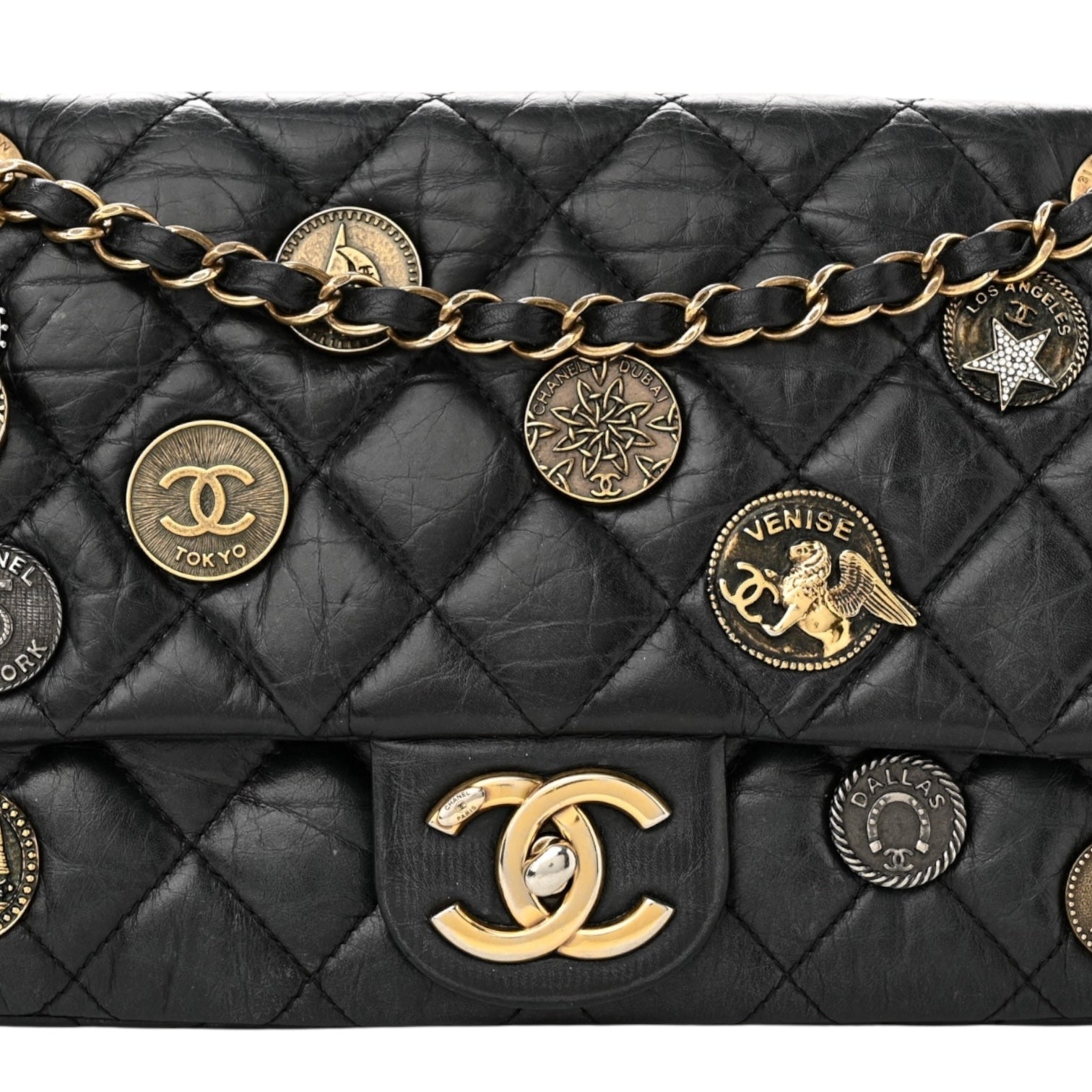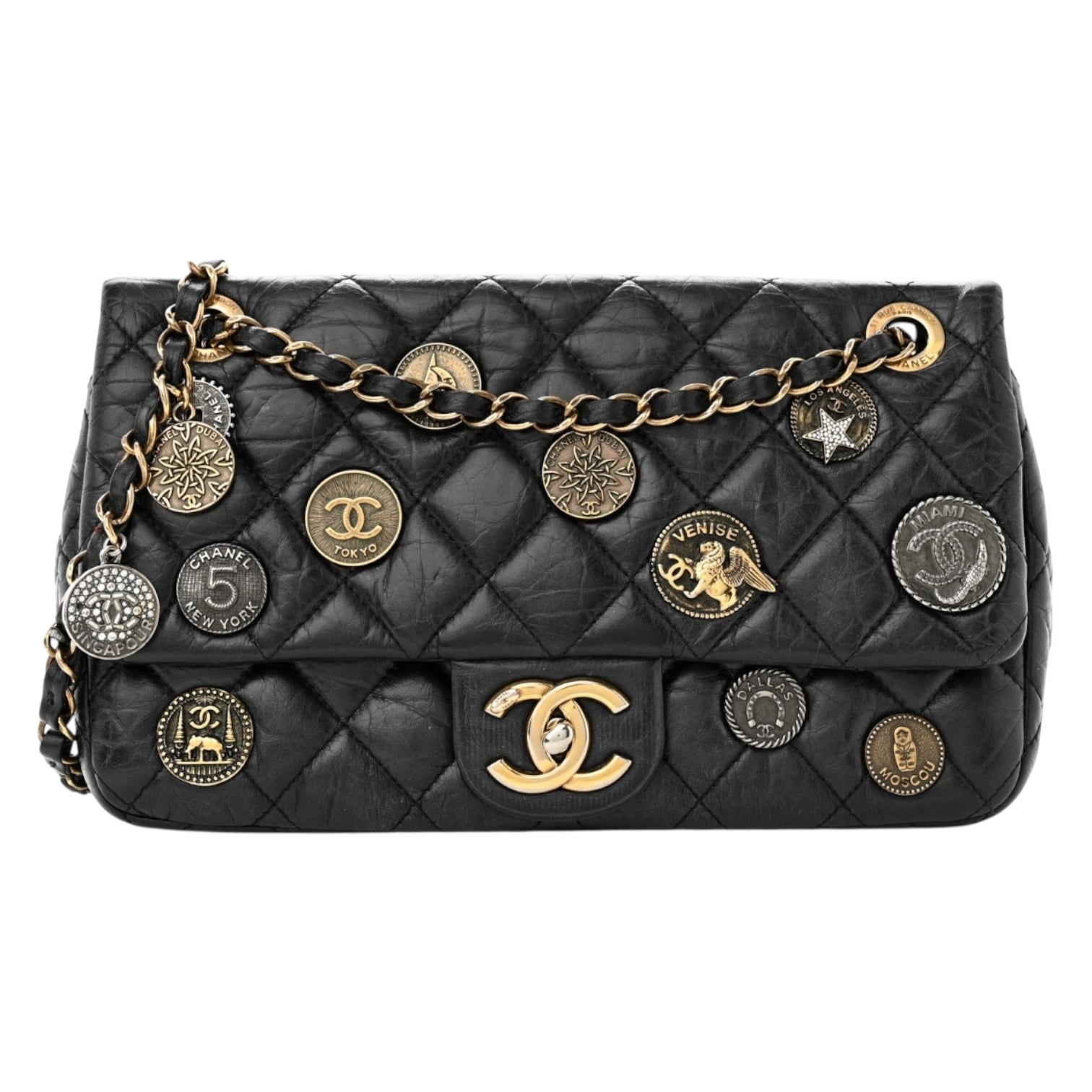 A striking twist on a timeless icon, this Chanel Medium Flap Bag is crafted from luxurious black aged calfskin leather in the classic diamond quilted design. The front flap is adorned with an eclectic mix of signature Chanel medallion charms and vintage-inspired coins, adding a bold, collectible edge to this coveted piece.