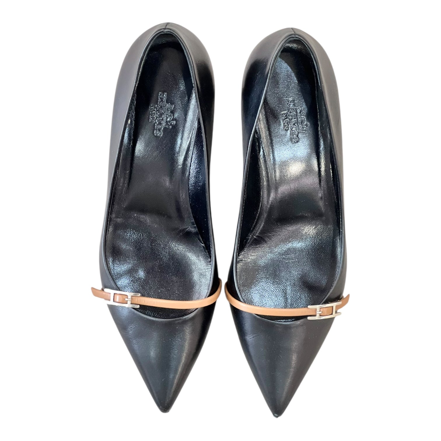 Sophisticated and timeless, these Hermès kitten heels are crafted from smooth black leather with a sleek pointed toe. A slim tan strap with the signature silver “H” hardware detail adds understated elegance. Finished with a comfortable low kitten heel, they are perfect for both day-to-night wear, embodying Hermès’ refined Parisian craftsmanship.