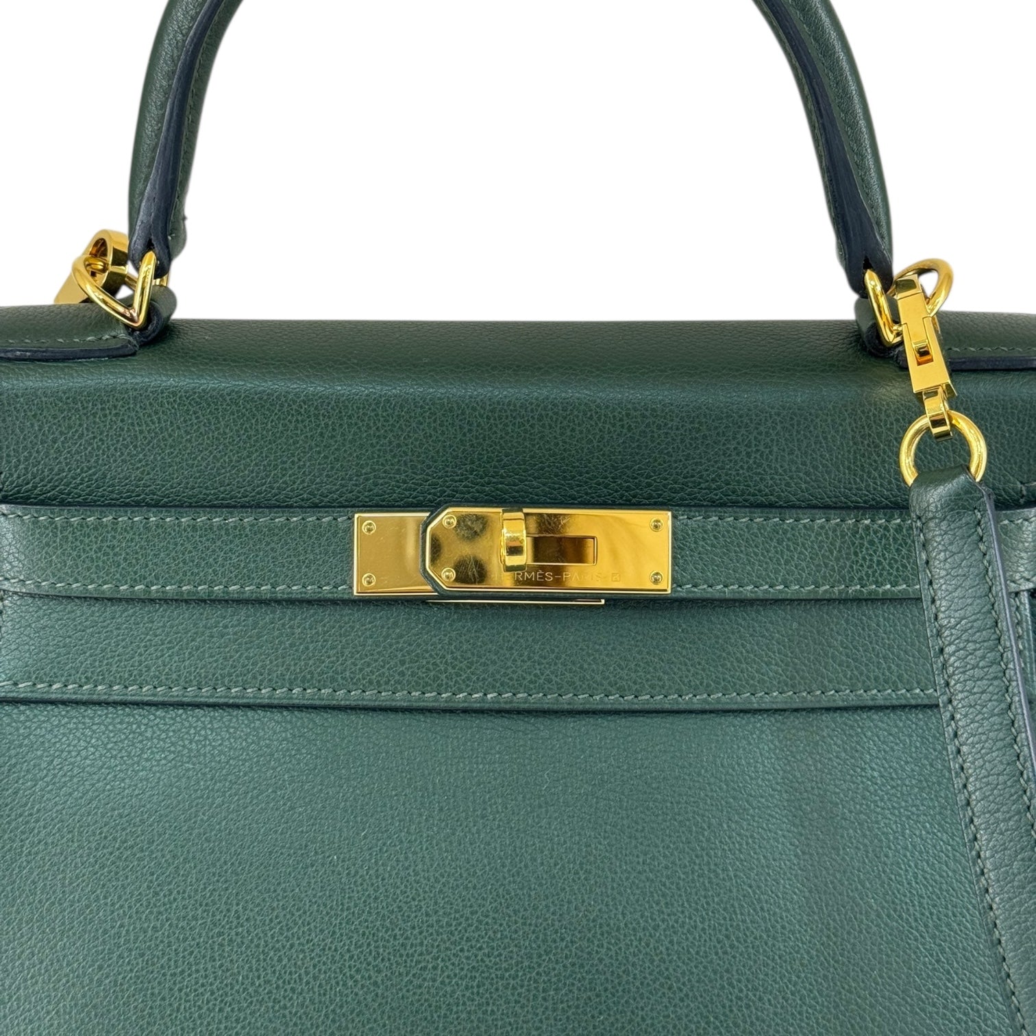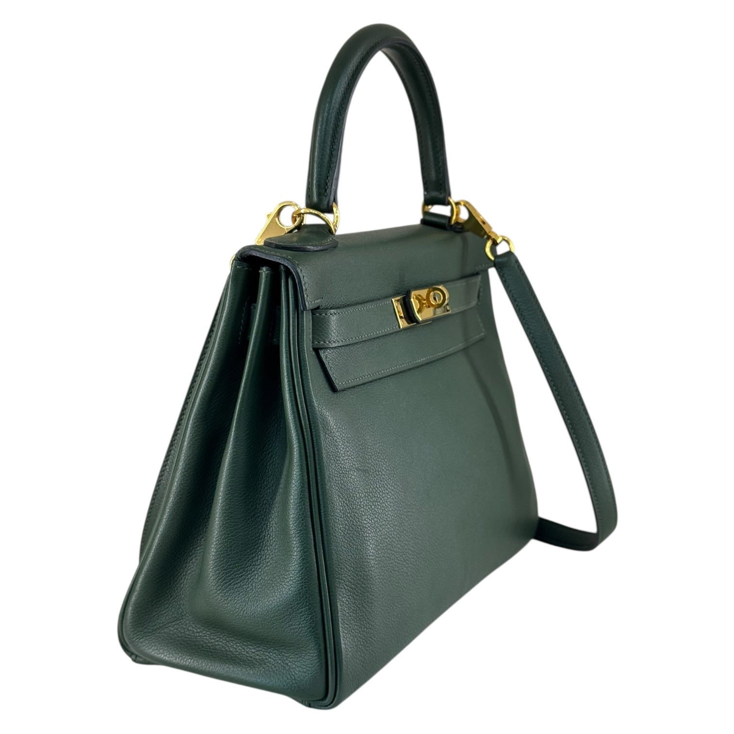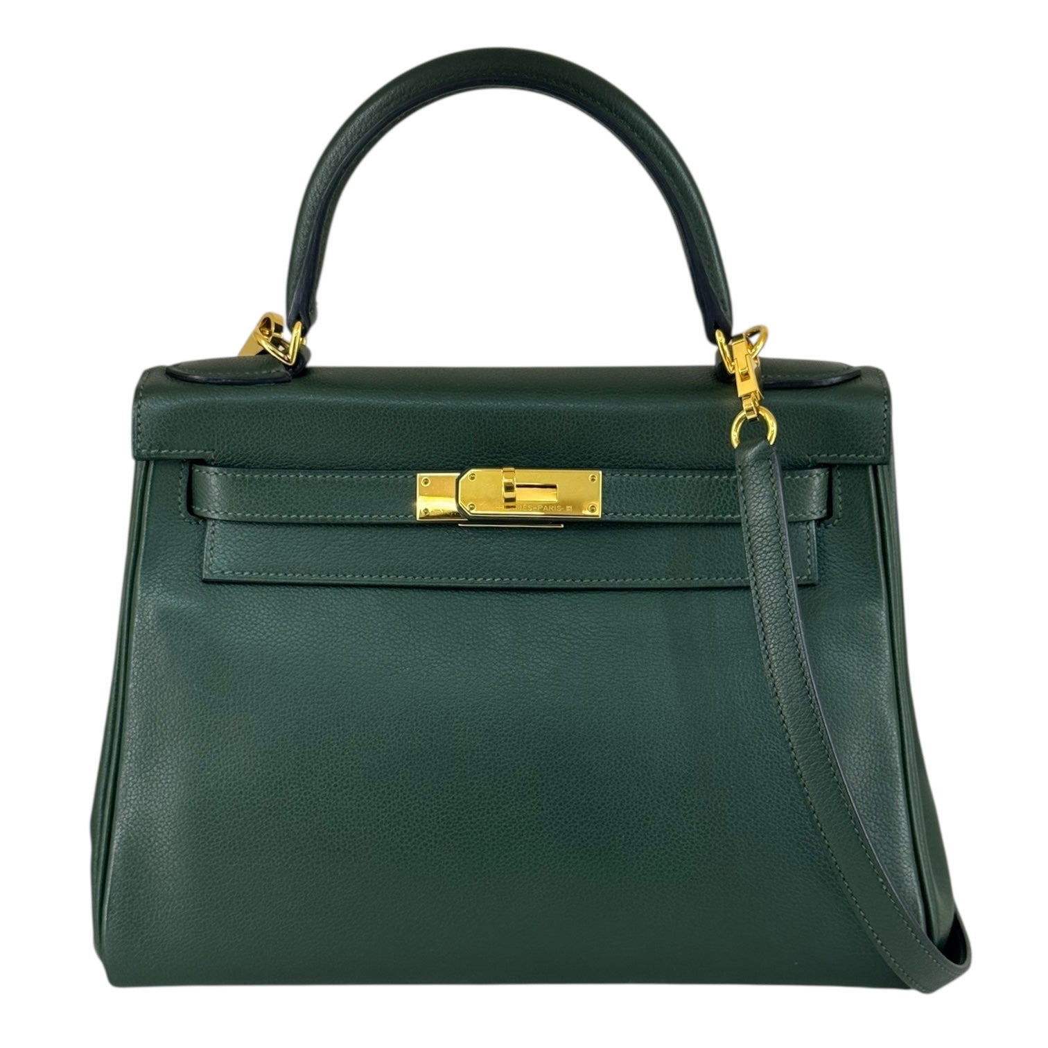 This Hermès Kelly 28 is a refined classic, crafted from supple Togo leather in rich Vert Anglais—a deep, sophisticated green that transitions effortlessly through seasons. Finished with gold-plated hardware, this elegant top-handle bag features the iconic Kelly silhouette in Retourne construction, offering a softer, more relaxed structure compared to the Sellier style.