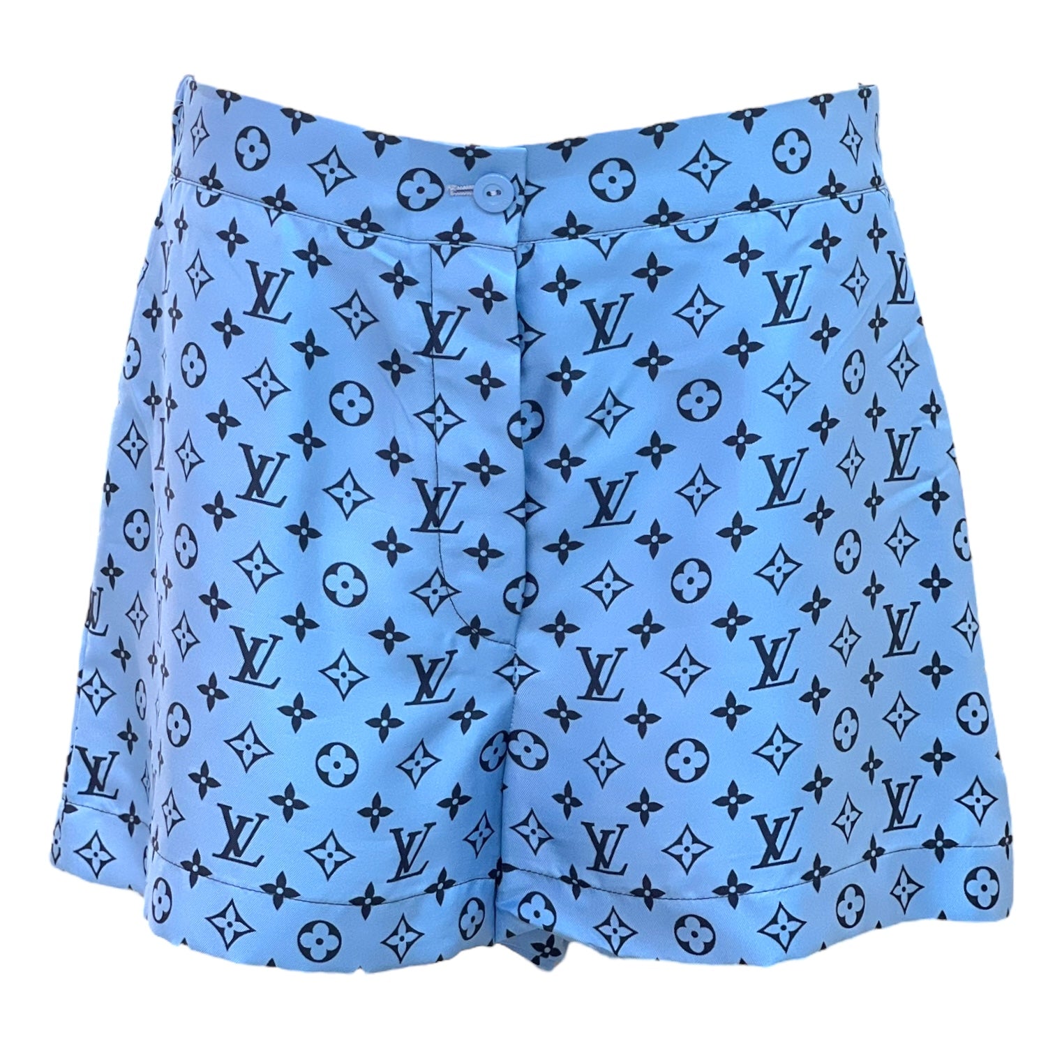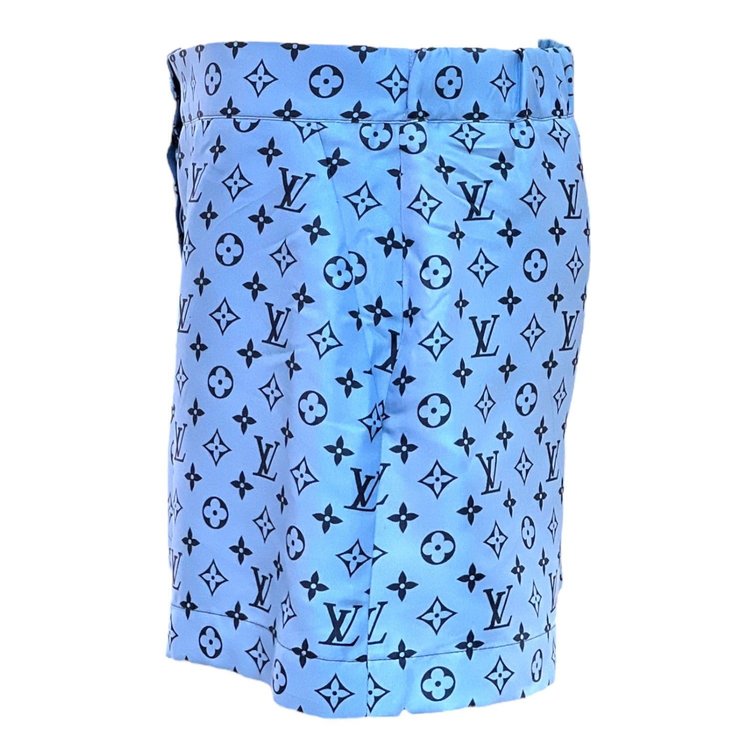 Elevate your style with these Louis Vuitton Blue Monogram Satin Shorts. Crafted from smooth satin, they offer a luxurious feel and eye-catching sheen. The iconic monogram print adds timeless elegance, making them perfect for chic, effortless looks. Comfortable and stylish, these shorts are a must-have for fashion-forward wardrobes.