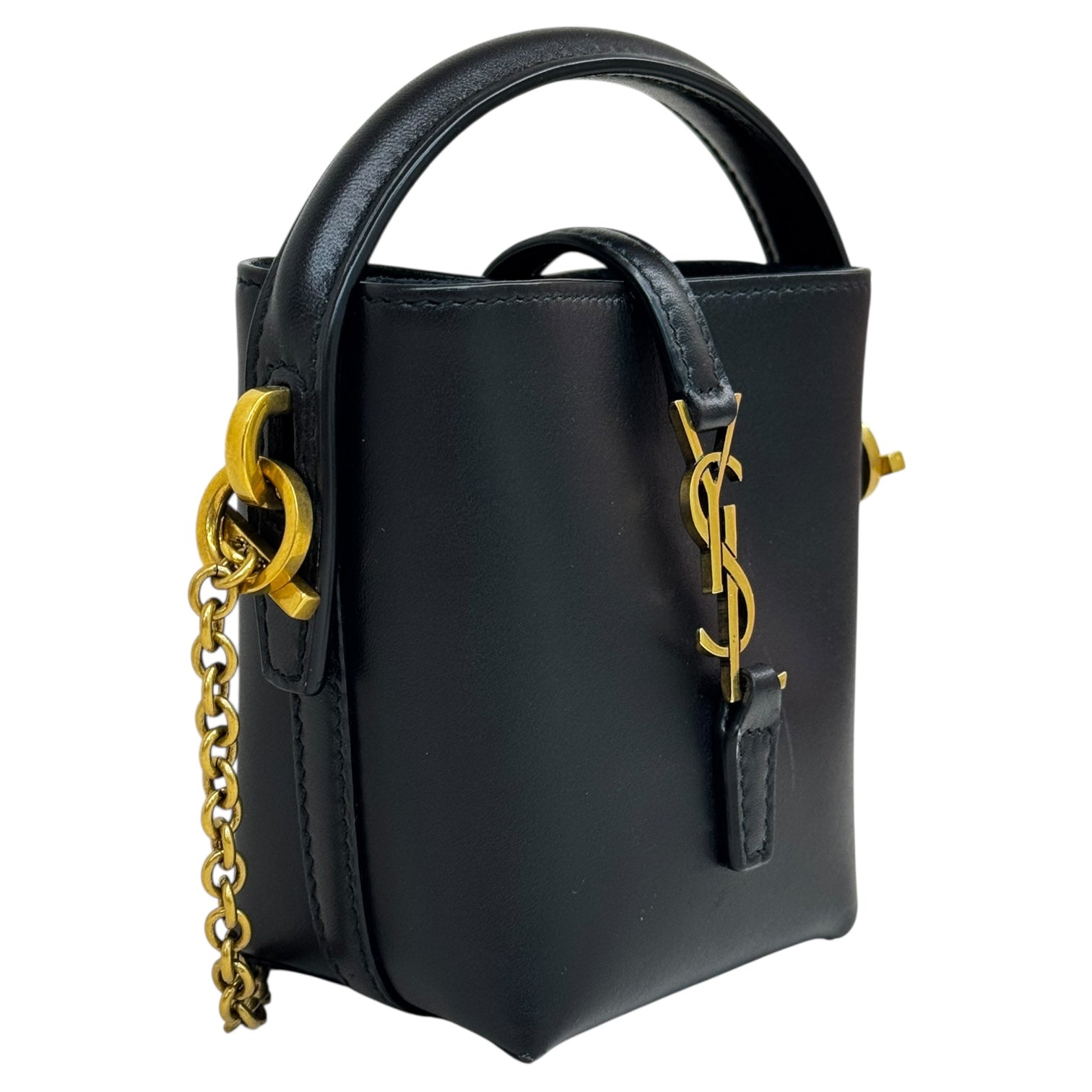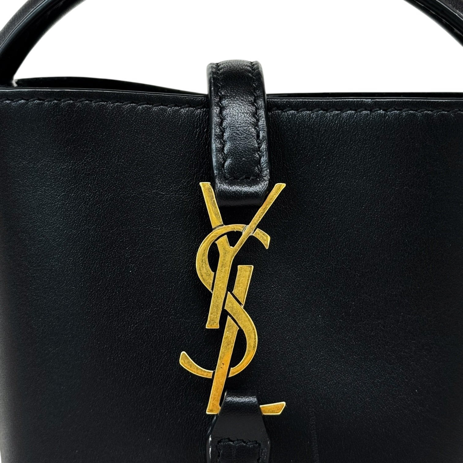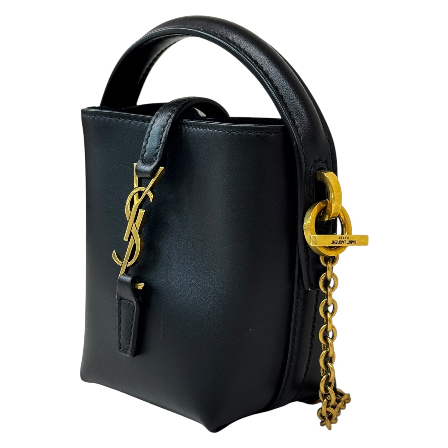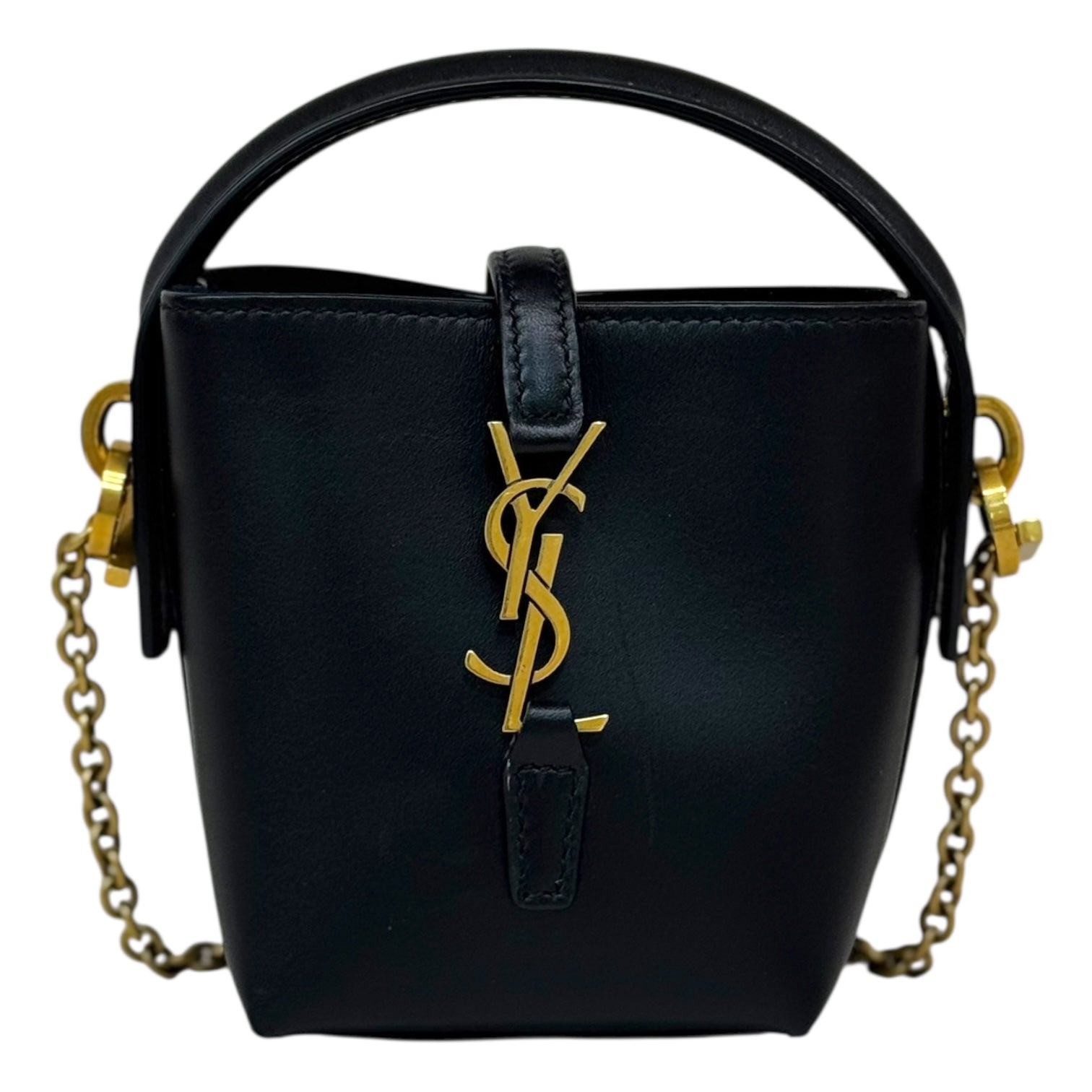 This Yves Saint Laurent Mini Le 37 Bucket Bag is a chic and structured take on a classic silhouette. Crafted in smooth black leather, the bag features a prominent gold-tone YSL monogram logo on the front flap tab, complemented by a short leather top handle and an elegant chain shoulder strap for versatile carry options. Compact yet refined, it opens to a minimal interior perfect for daily essentials. A luxurious statement piece that effortlessly transitions from day to night.