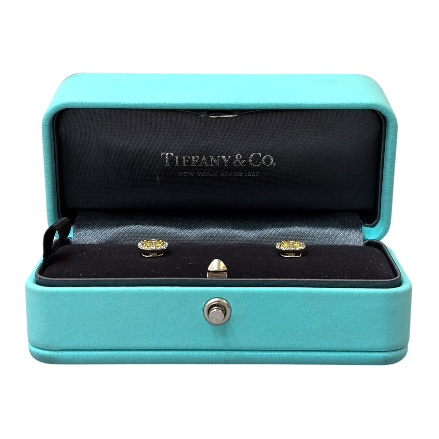 A breathtaking expression of Tiffany craftsmanship, these Tiffany & Co. Soleste Fancy Yellow Diamond Halo Stud Earrings showcase a pair of luminous cushion-cut fancy yellow diamonds, each encircled by a scintillating halo of brilliant white diamonds. Meticulously crafted in a combination of platinum (Pt950) and 18K yellow gold (Au750), the design highlights the vivid color and exceptional clarity of the centre stones.