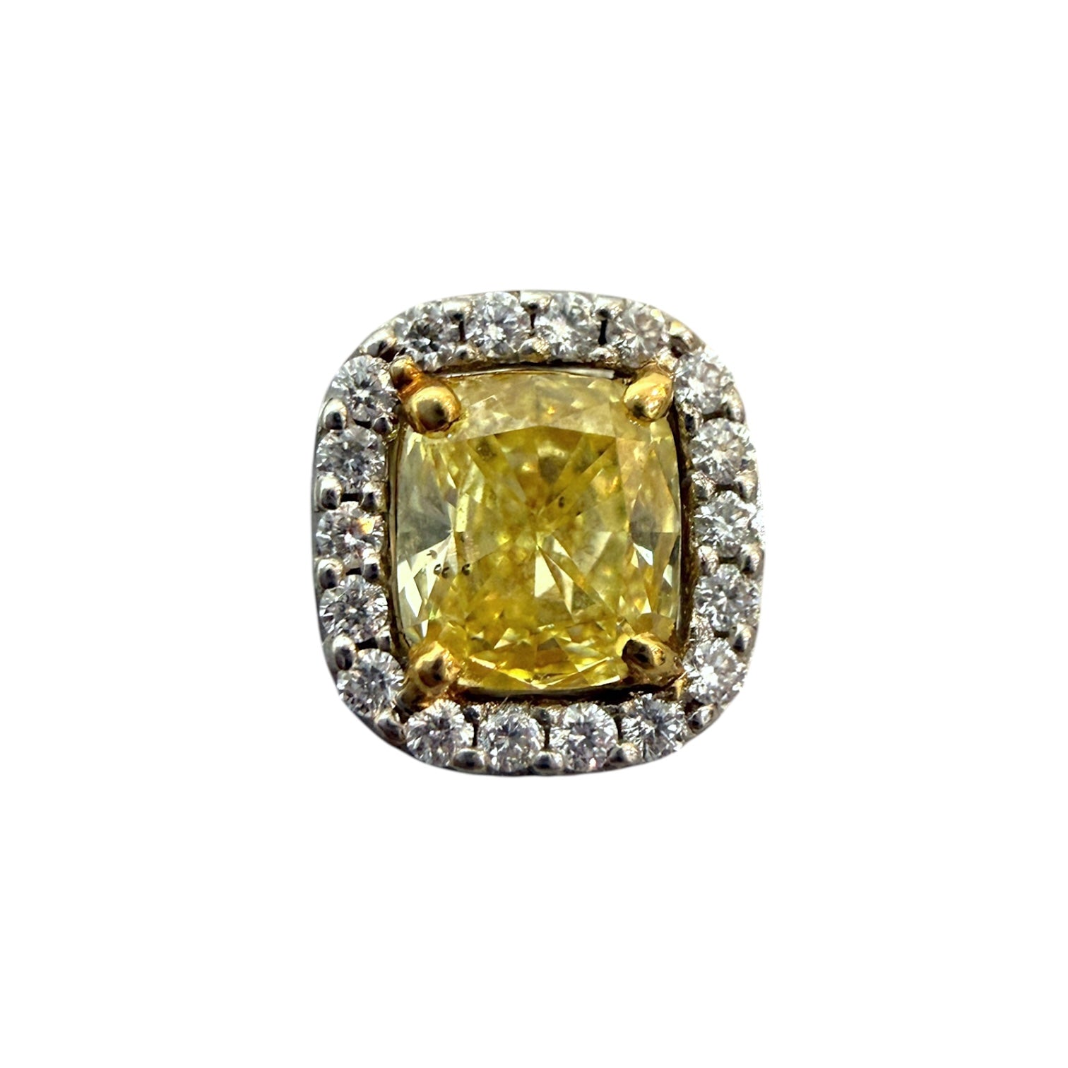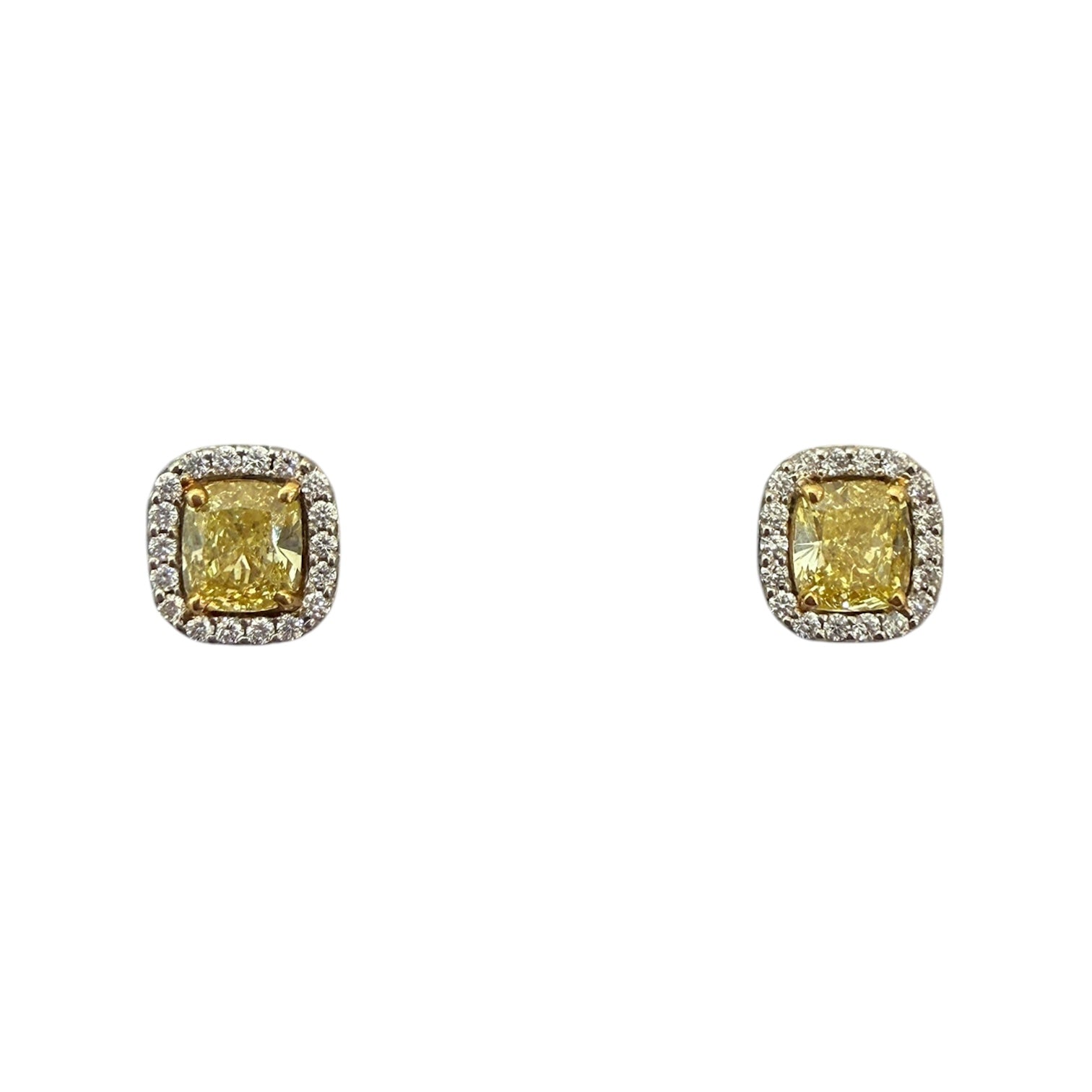 Each earring features a cushion brilliant fancy yellow diamond—one 0.52 ct VVS1 and the other 0.52 ct VS1—totaling 1.04 carats, complemented by 0.13 ct of high-quality F–G color, VS1–VS2 clarity side stones. The elegant halo measures 7.4 x 6.9 mm, delivering a refined yet striking presence on the ear.